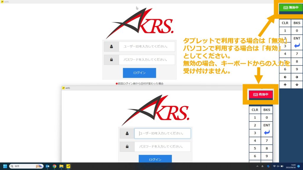 右上のキーボードモードを「無効」とした上で、画面内のテンキーをタッチすることで利用してください。