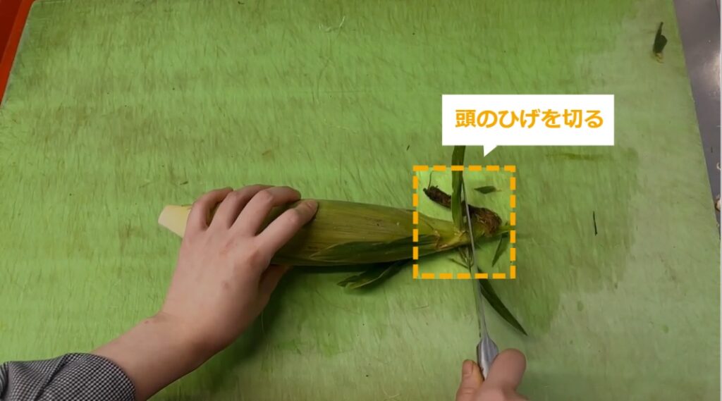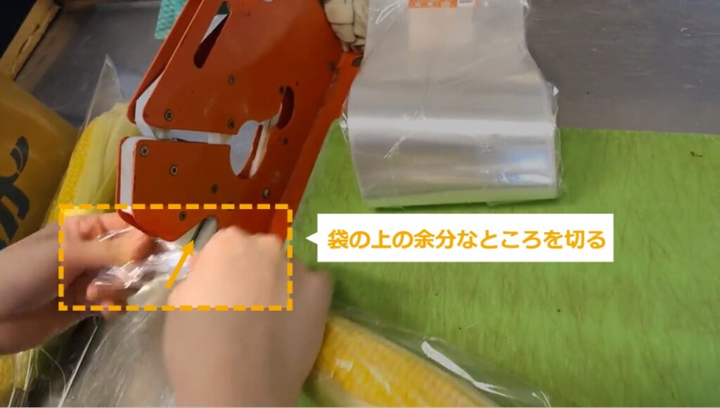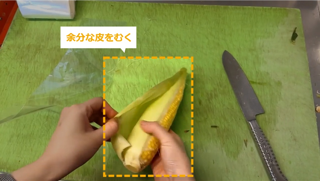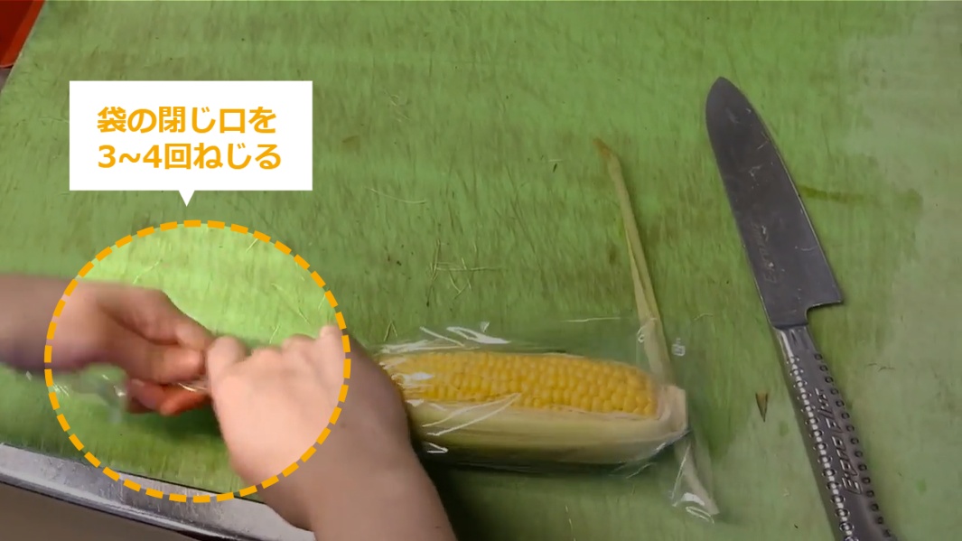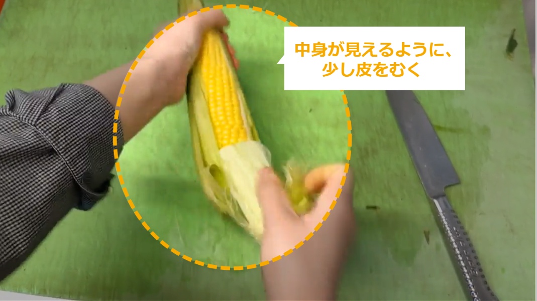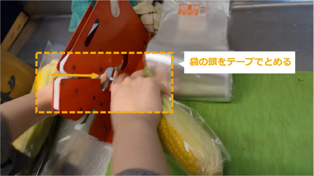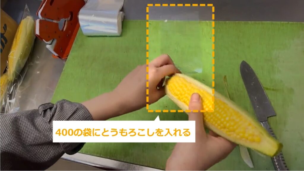 とうもろこしの商品化 ・とうもろこしの商品化について説明します。 STEP1~:とうもろこしの商品化 STEP1:【動画】とうもろこしの商品化 STEP2:頭のひげを切る STEP3:周りの葉を落とす STEP4:おしりを少し切る STEP5:中身が少し見えるように、少し皮をむく STEP6:余分な皮をむく STEP7:400の袋にとうもろこしを入れる STEP8:袋の閉じ口を3~4回ねじる STEP9:袋の頭をテープでとめる STEP10:袋の余分なところを切る