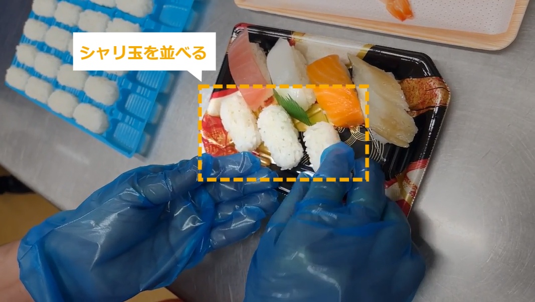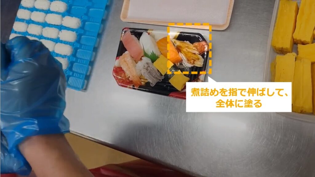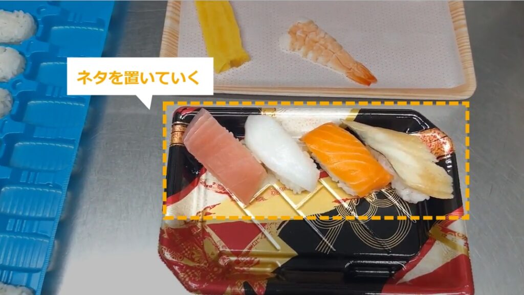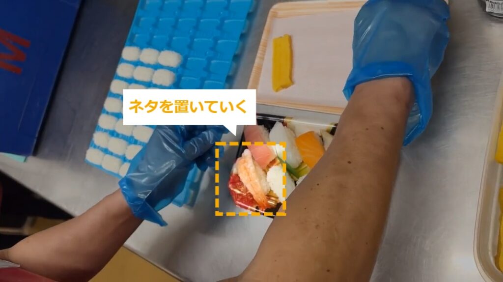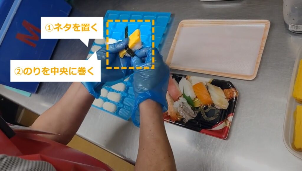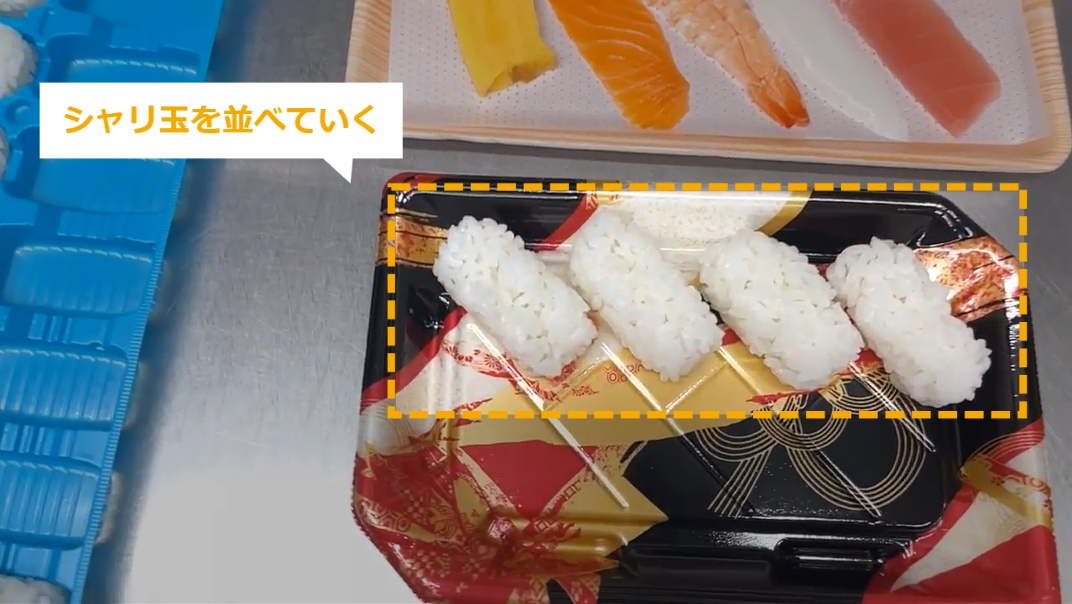 にぎり寿司(彩) ・にぎり寿司(彩)の作り方を説明します。 STEP1~11:作り方 STEP1:通し動画】作り方 STEP2:両手にビニール手袋をはめる STEP3:上段にシャリ玉を並べていく STEP4:上段にネタを置いていく STEP5:バランを置く STEP6:下段にシャリ玉を並べる STEP7:下段にネタを置いていく STEP8:たまごのお寿司をつくる STEP9:煮詰めを穴子に塗る STEP10:煮詰めを指で伸ばして、全体に塗る STEP11:完成