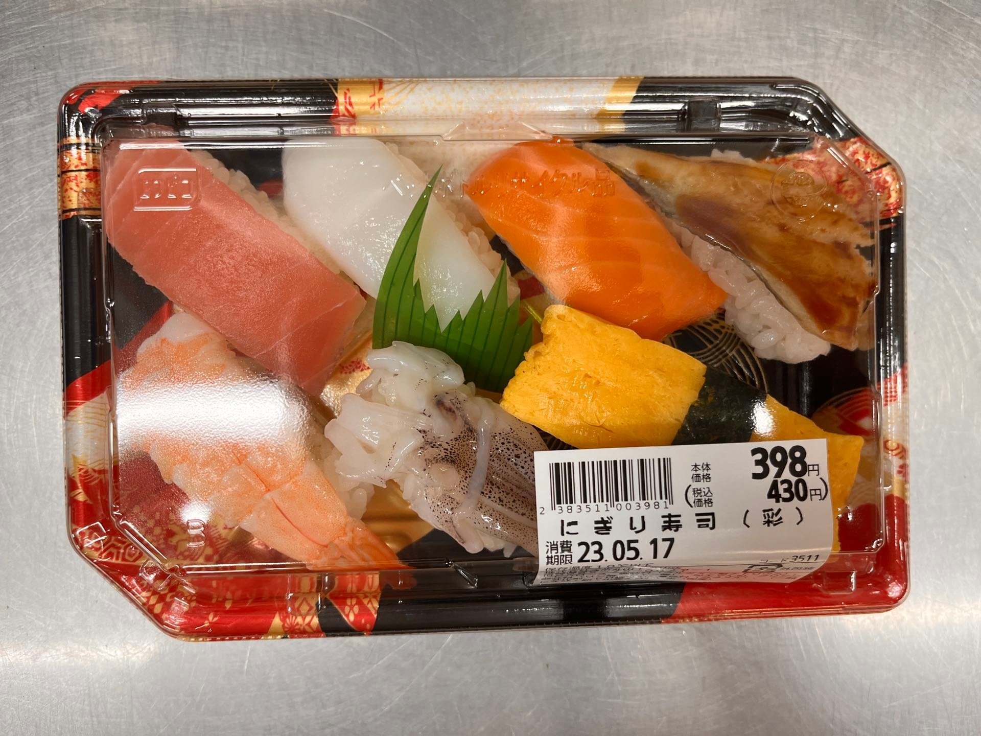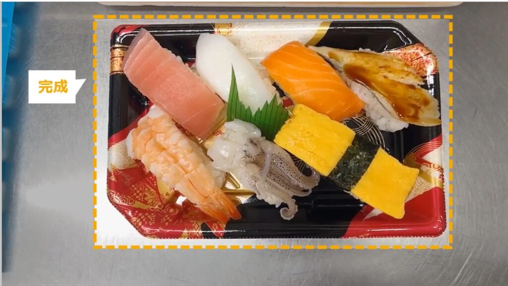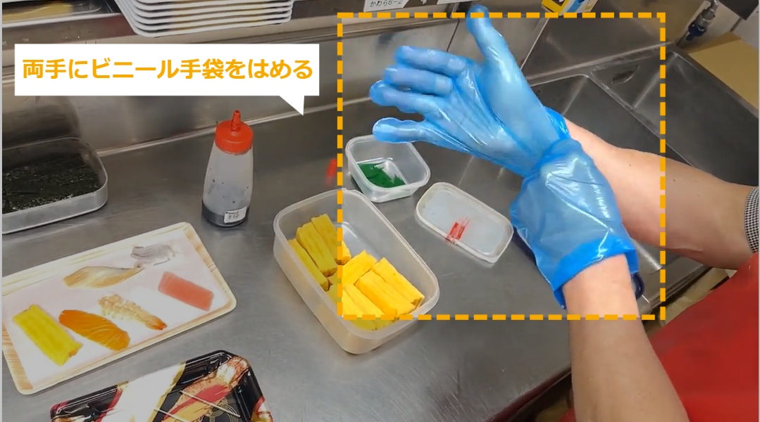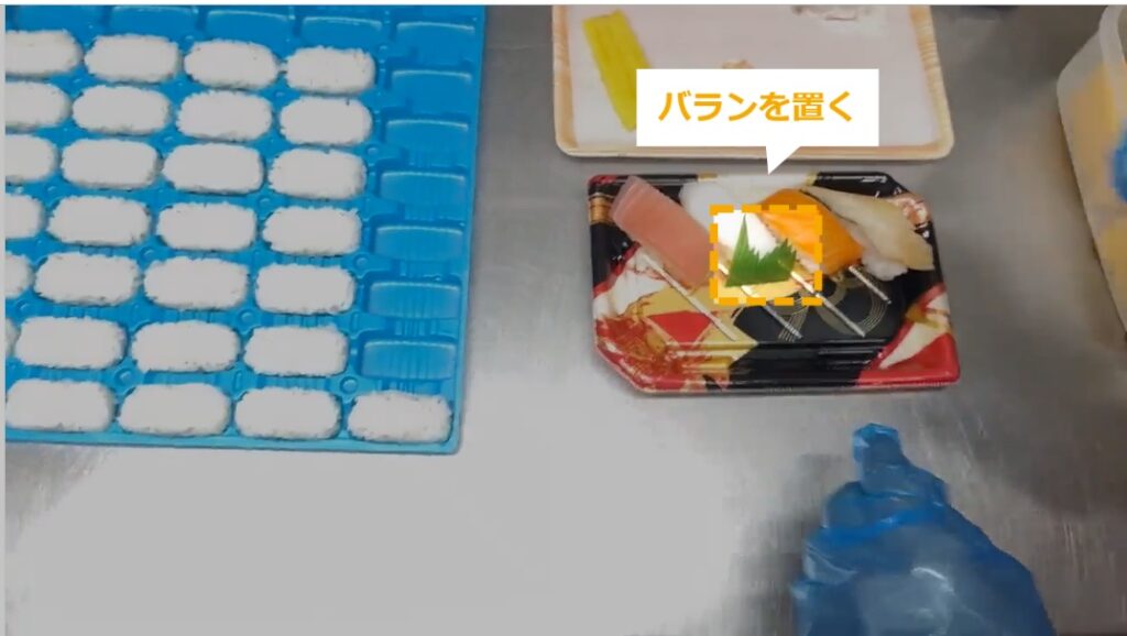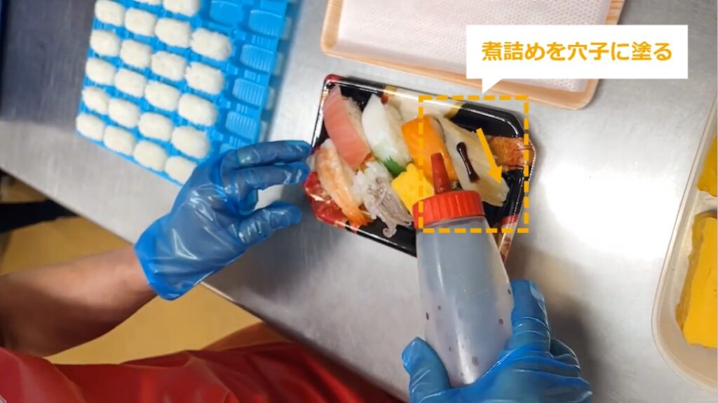 にぎり寿司(彩) ・にぎり寿司(彩)の作り方を説明します。 STEP1~11:作り方 STEP1:通し動画】作り方 STEP2:両手にビニール手袋をはめる STEP3:上段にシャリ玉を並べていく STEP4:上段にネタを置いていく STEP5:バランを置く STEP6:下段にシャリ玉を並べる STEP7:下段にネタを置いていく STEP8:たまごのお寿司をつくる STEP9:煮詰めを穴子に塗る STEP10:煮詰めを指で伸ばして、全体に塗る STEP11:完成