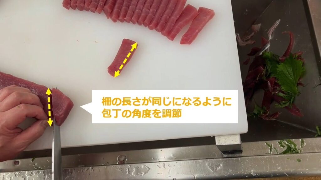 最初の天身の切り方によって柵の長さが異なってしまうので、 包丁の角度を変えて長さを調節します