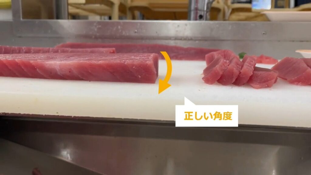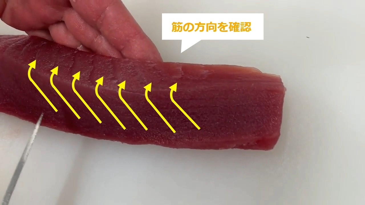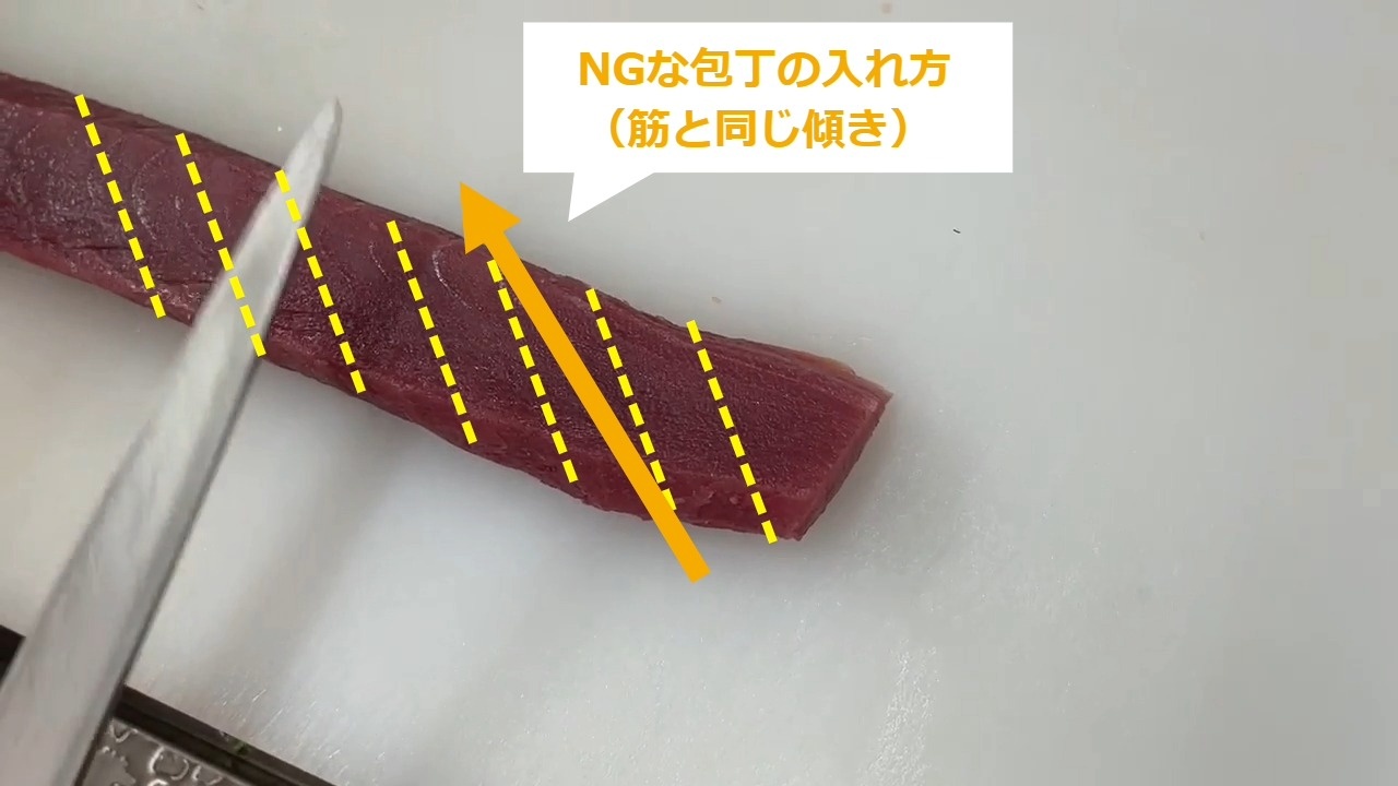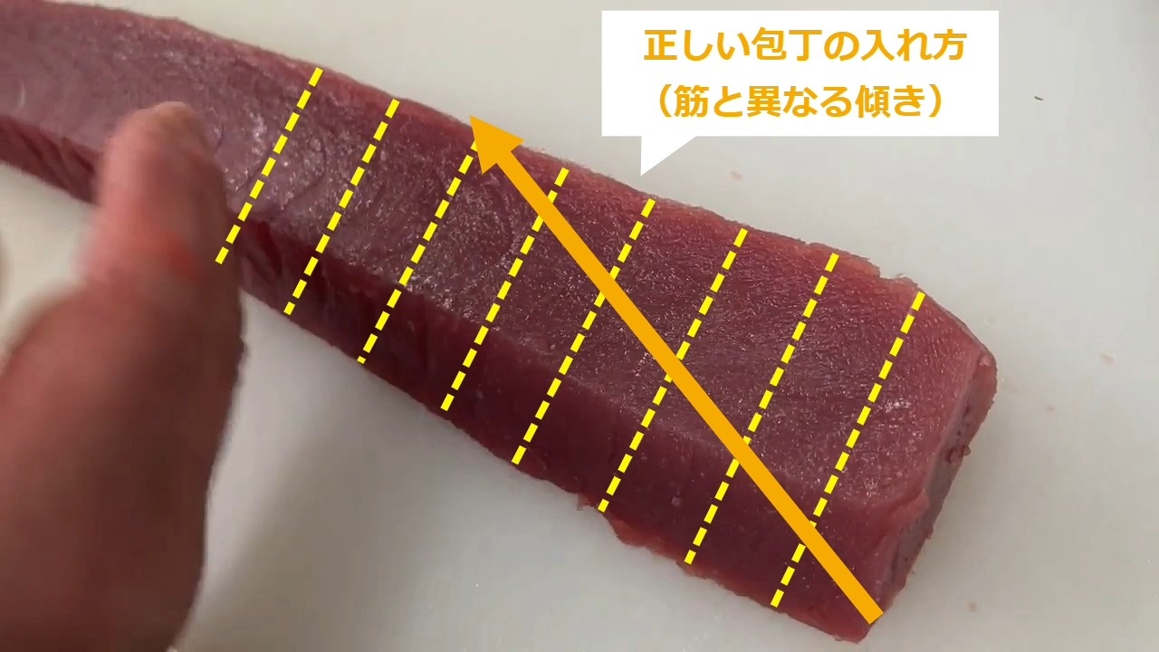 筋と同じ傾きに包丁を入れると、柵が筋に沿って崩れやすくなります