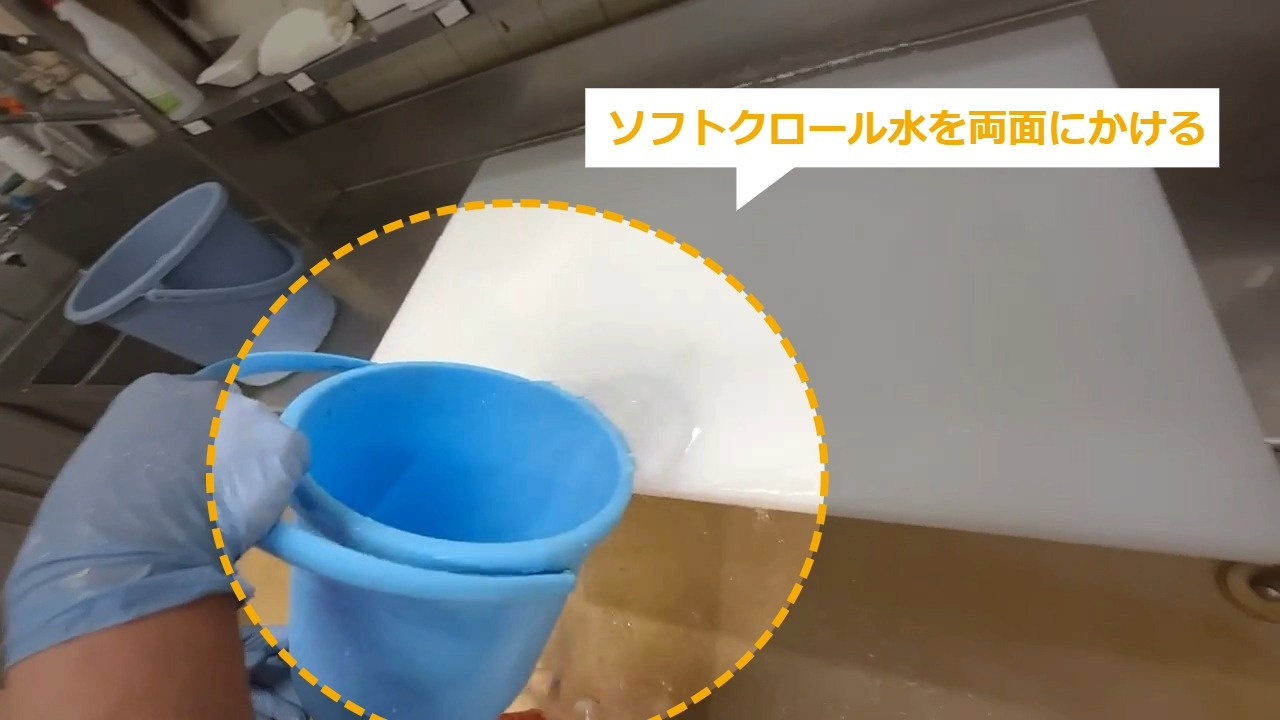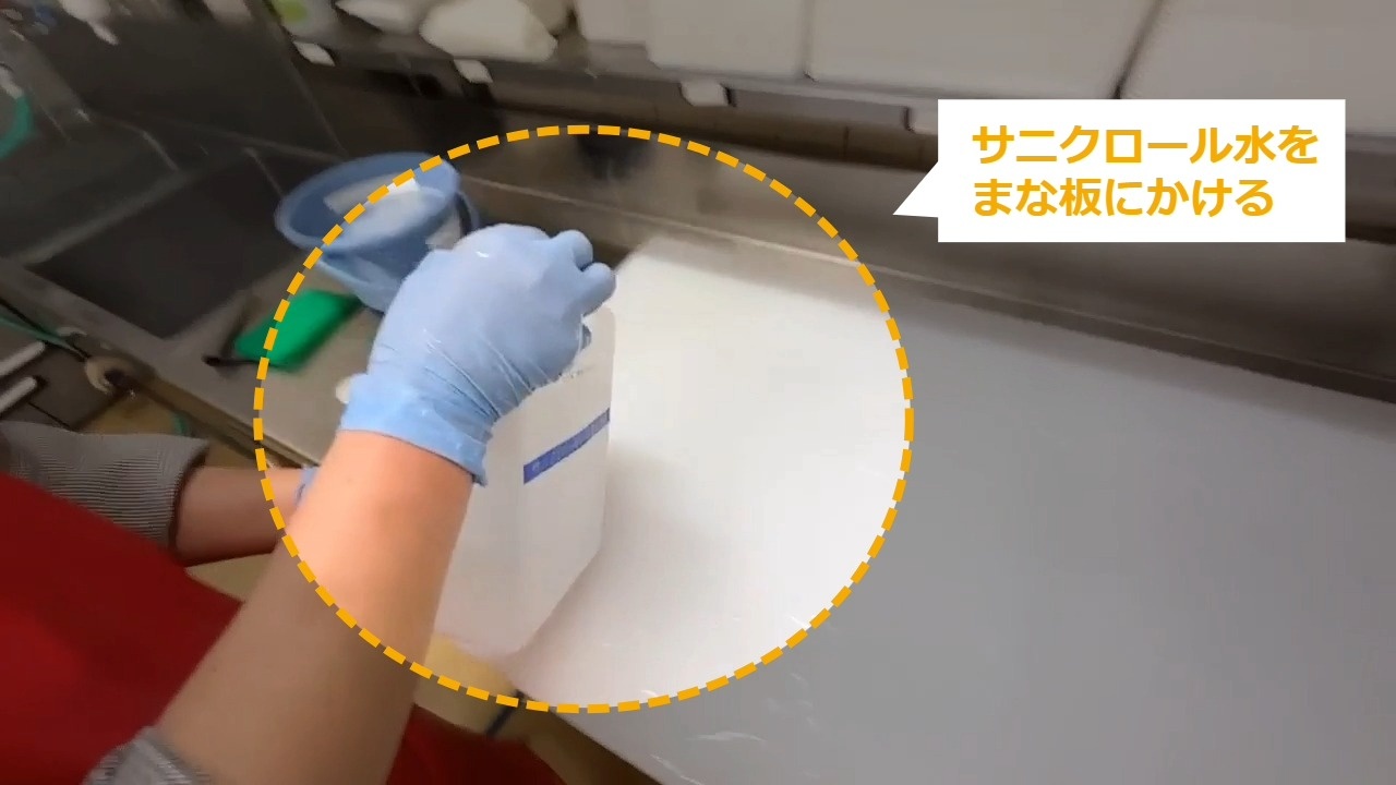 STEP9:サニクロール水をまな板にかける