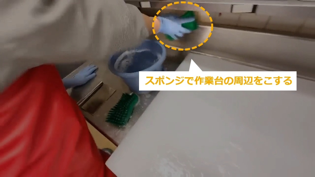 STEP7:洗剤で洗う(2/3):スポンジで作業台の周辺をこする