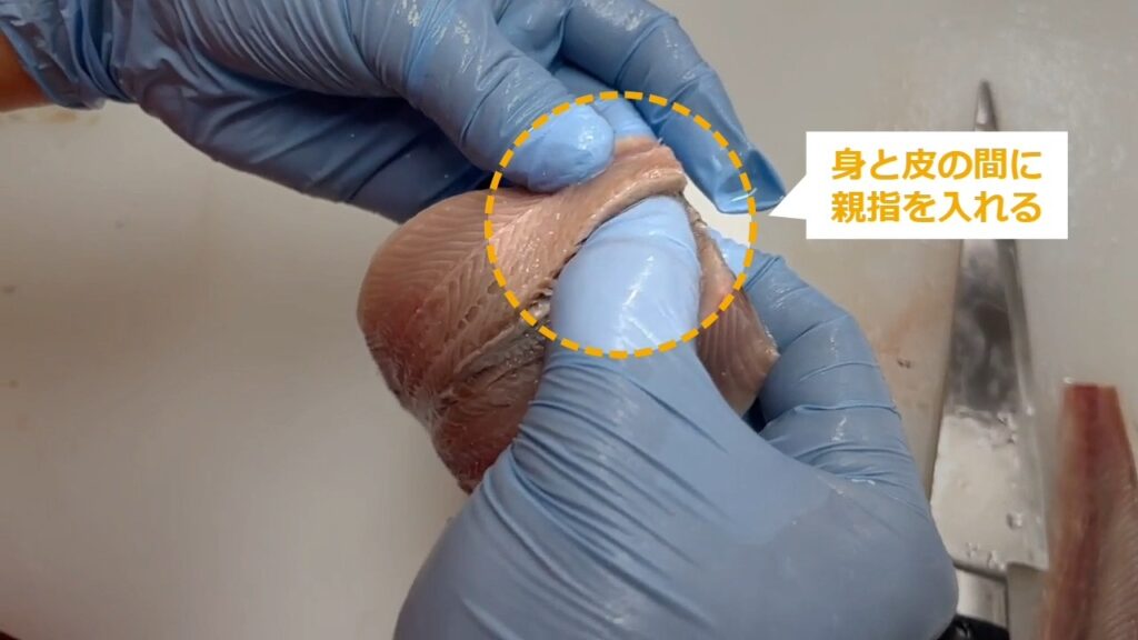 背中まで切り離してしまうと、皮をはぐのが難しくなります