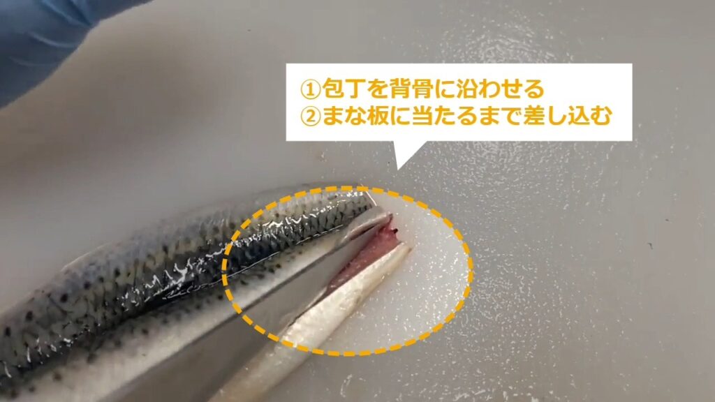 STEP8:背骨に沿って包丁を差し込む