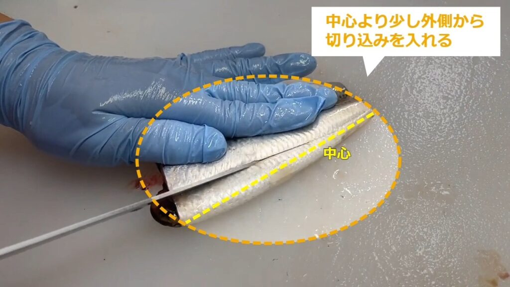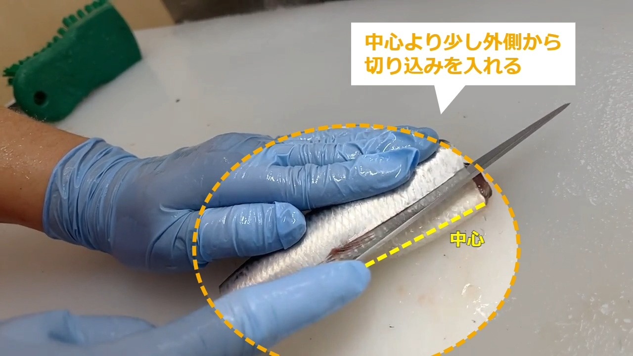 はらわたを避けるため、中心より少し外側から切り込みを入れます。