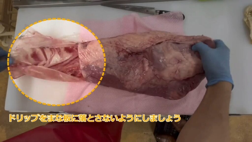・袋にドリップが溜まっていますので、まな板にこぼさないように袋から肉を取り出します。