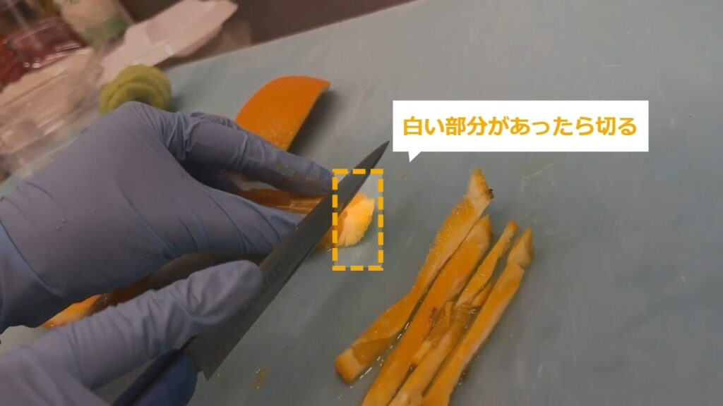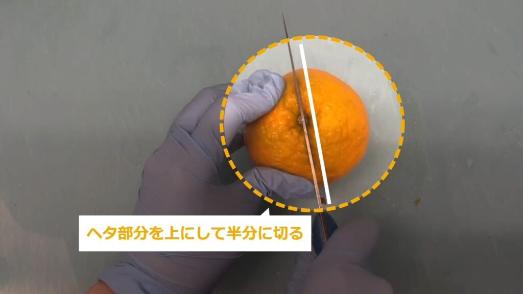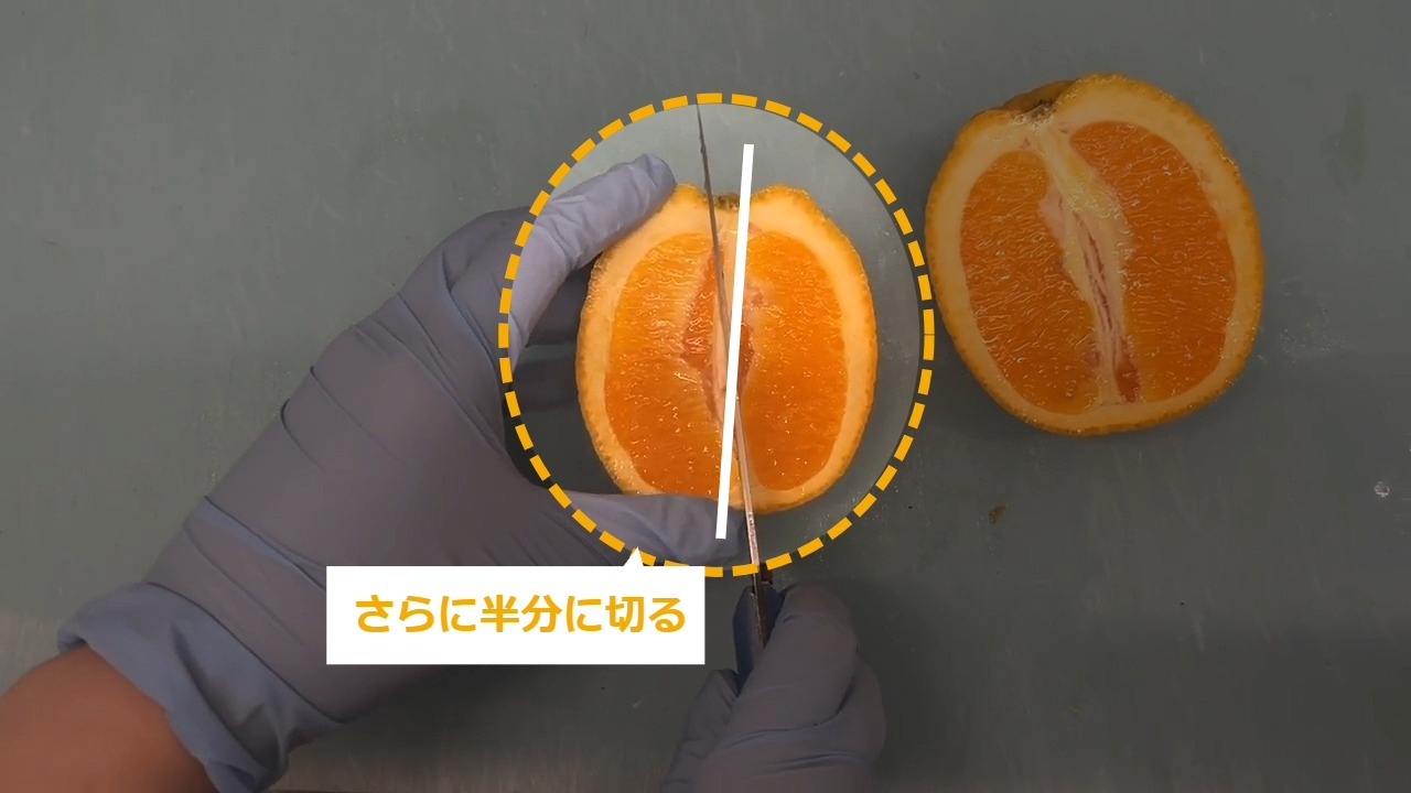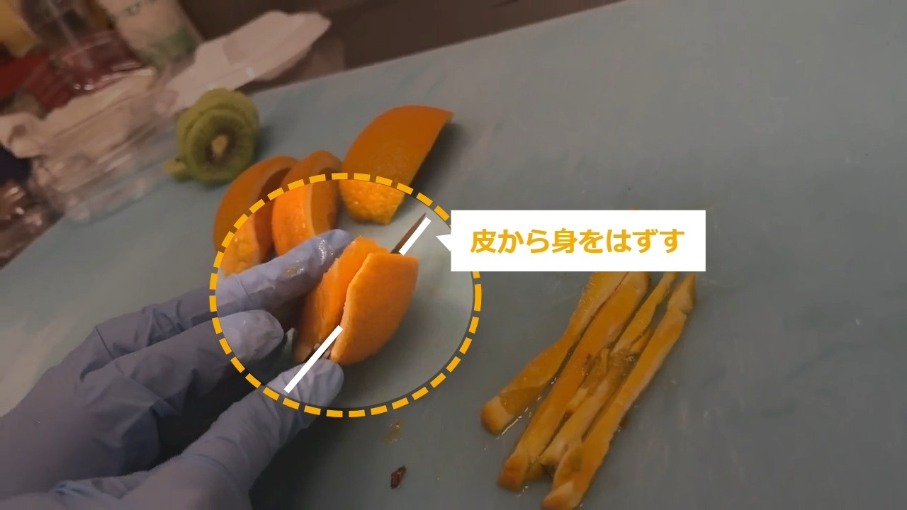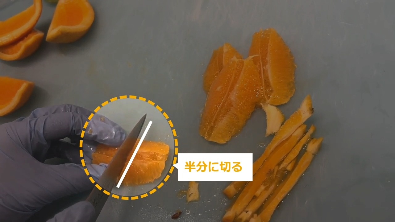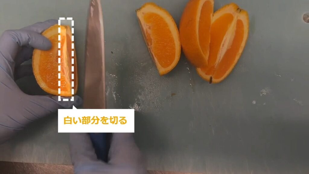 カットフルーツ【オレンジ】 ・オレンジの切り方について説明します。 STEP1~7:カットフルーツ(オレンジ) STEP1:【動画】カットフルーツ(オレンジ) STEP2:ヘタ部分を上にして半分に切る STEP3:さらに半分に切る STEP4:白い部分を切る STEP5:皮を身からはずす STEP6:白い部分があったら切る STEP7:半分に切る