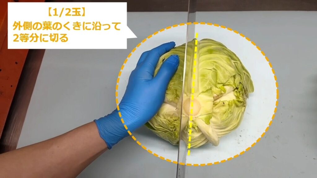 1玉の状態から、外側の葉のくきに沿って2等分に切ります。