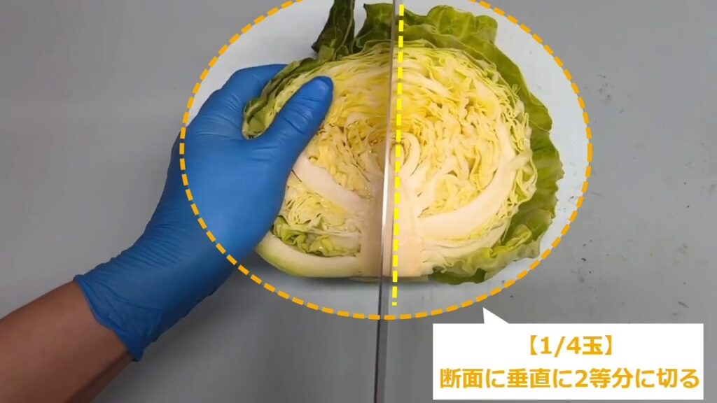 ・断面に対して垂直に2等分に切る(1/4玉はここで完了)