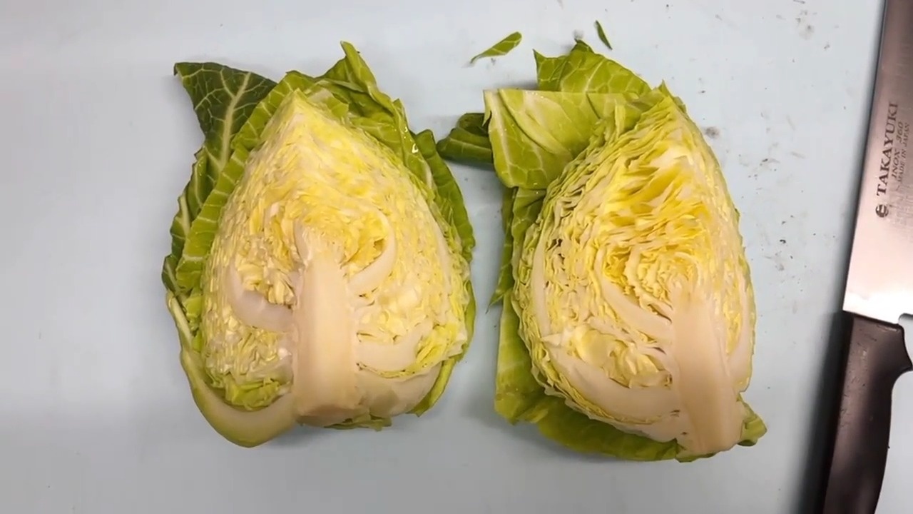 ・外側の葉のくきに沿って2等分に切る(1/2玉はここで完了)