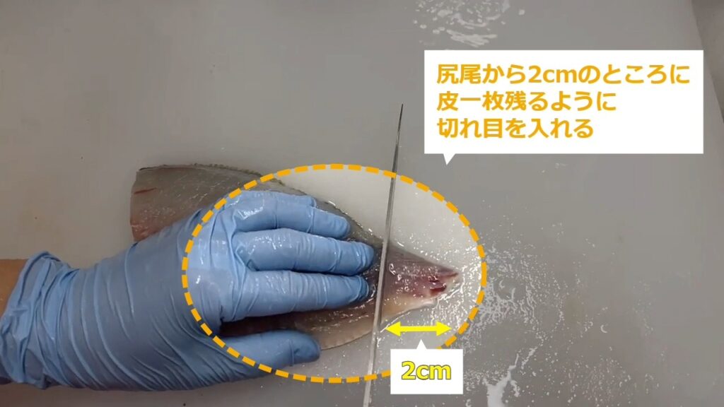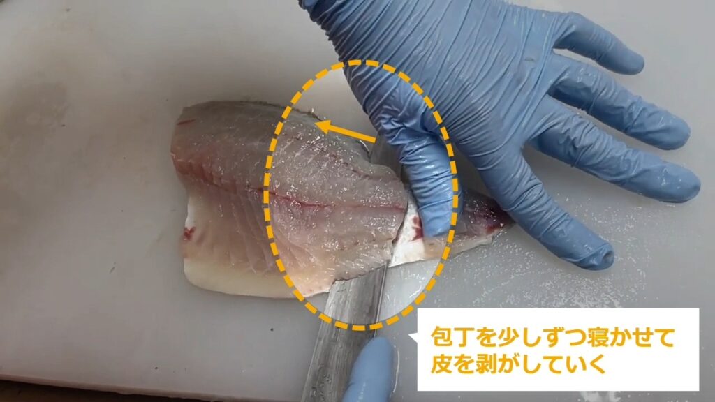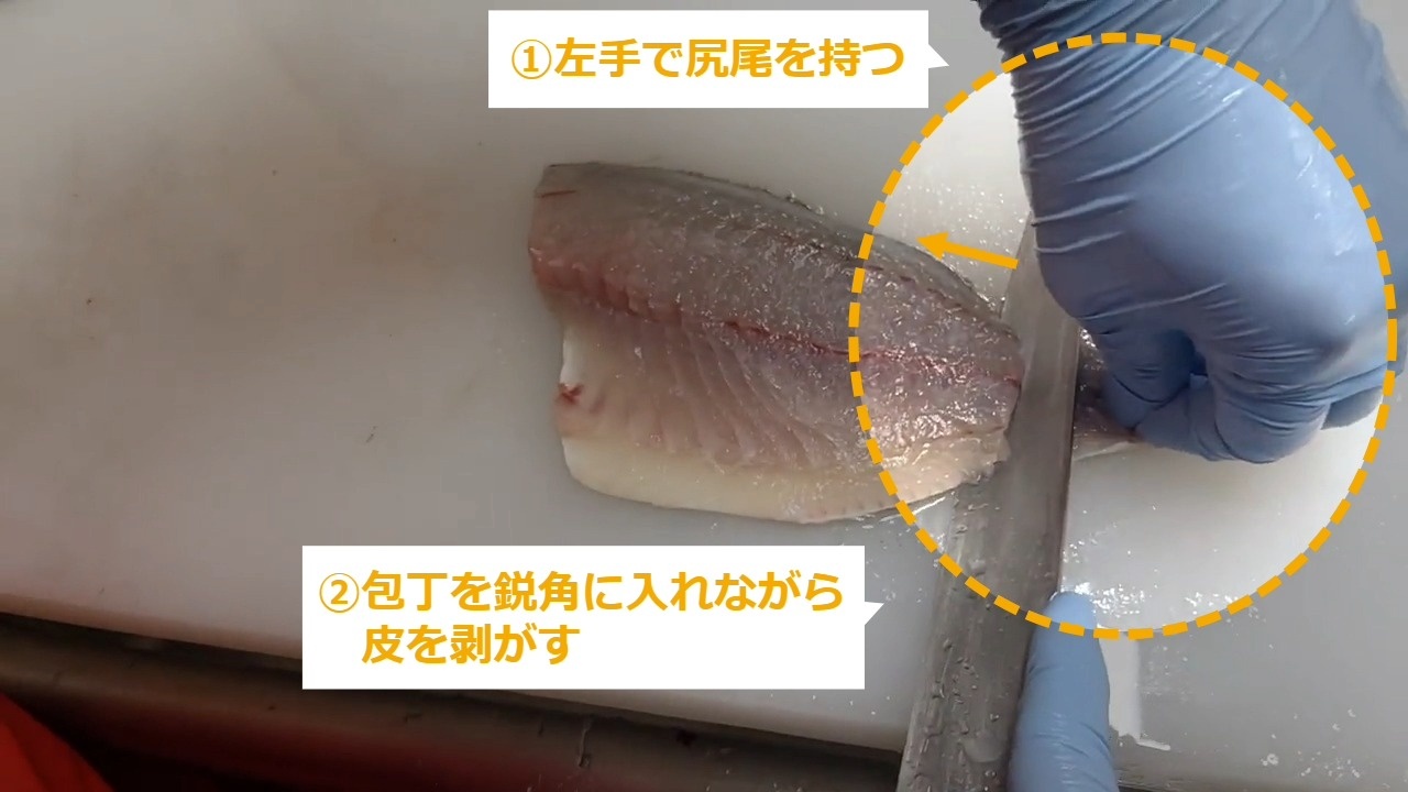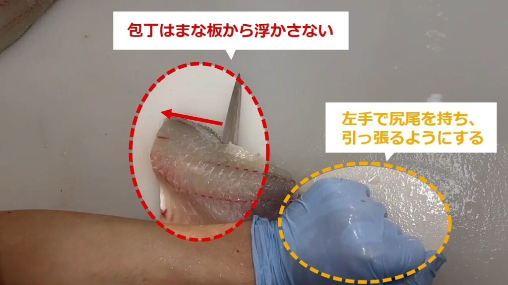 STEP5:左手で尻尾を持ち、包丁を鋭角に入れながら皮を剥がす