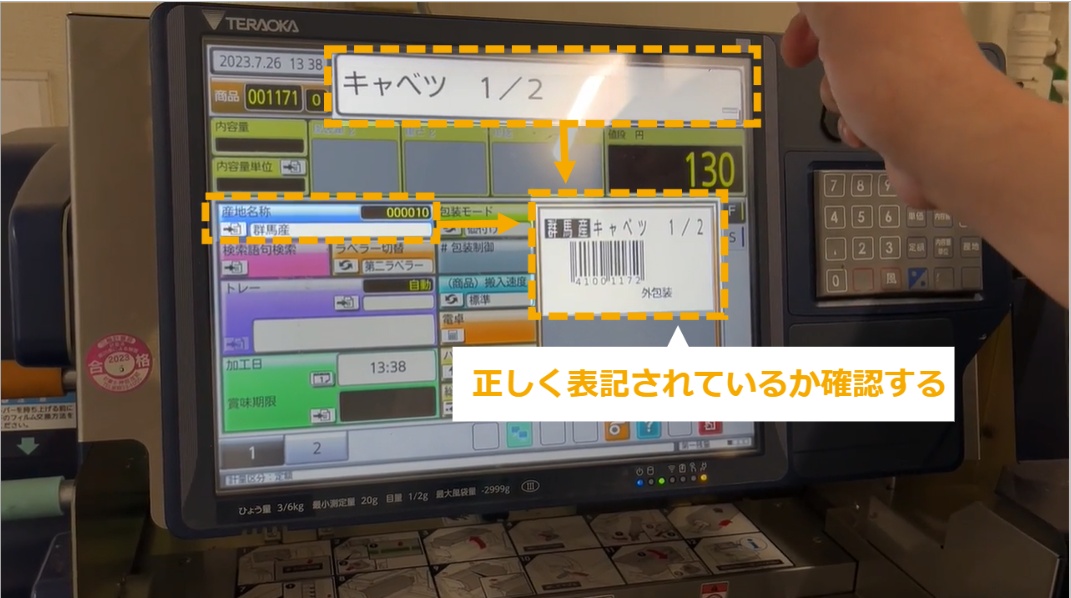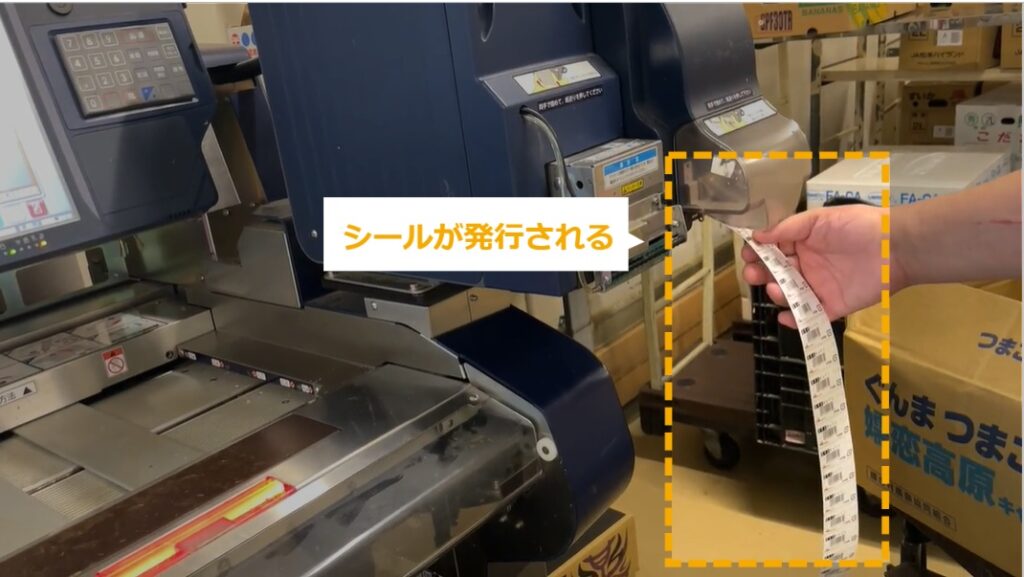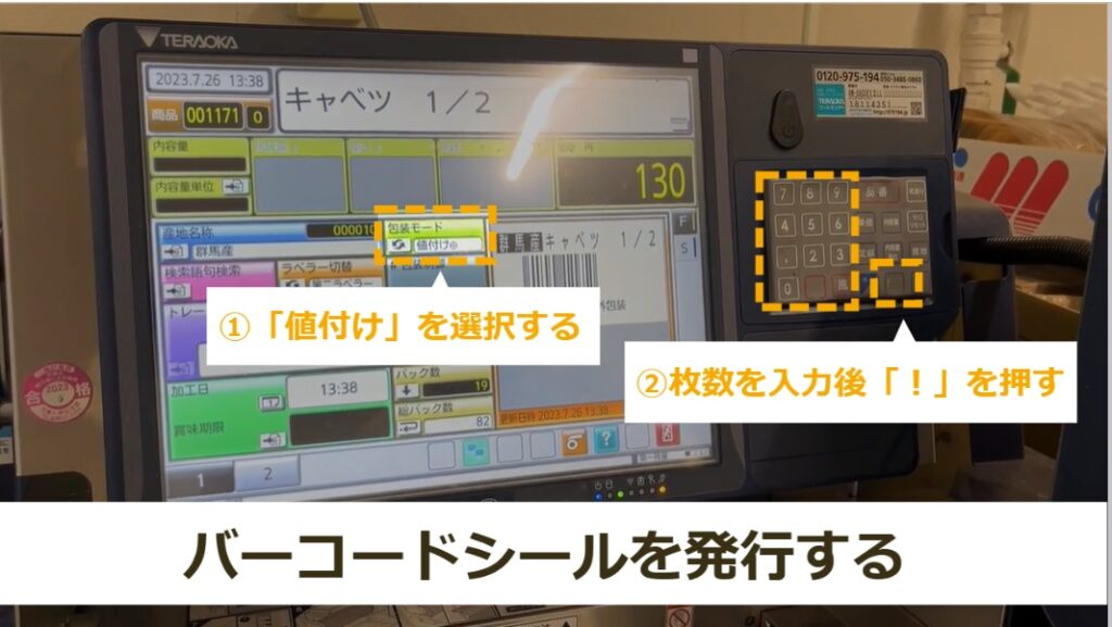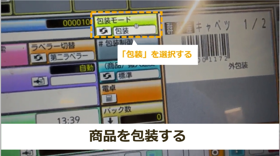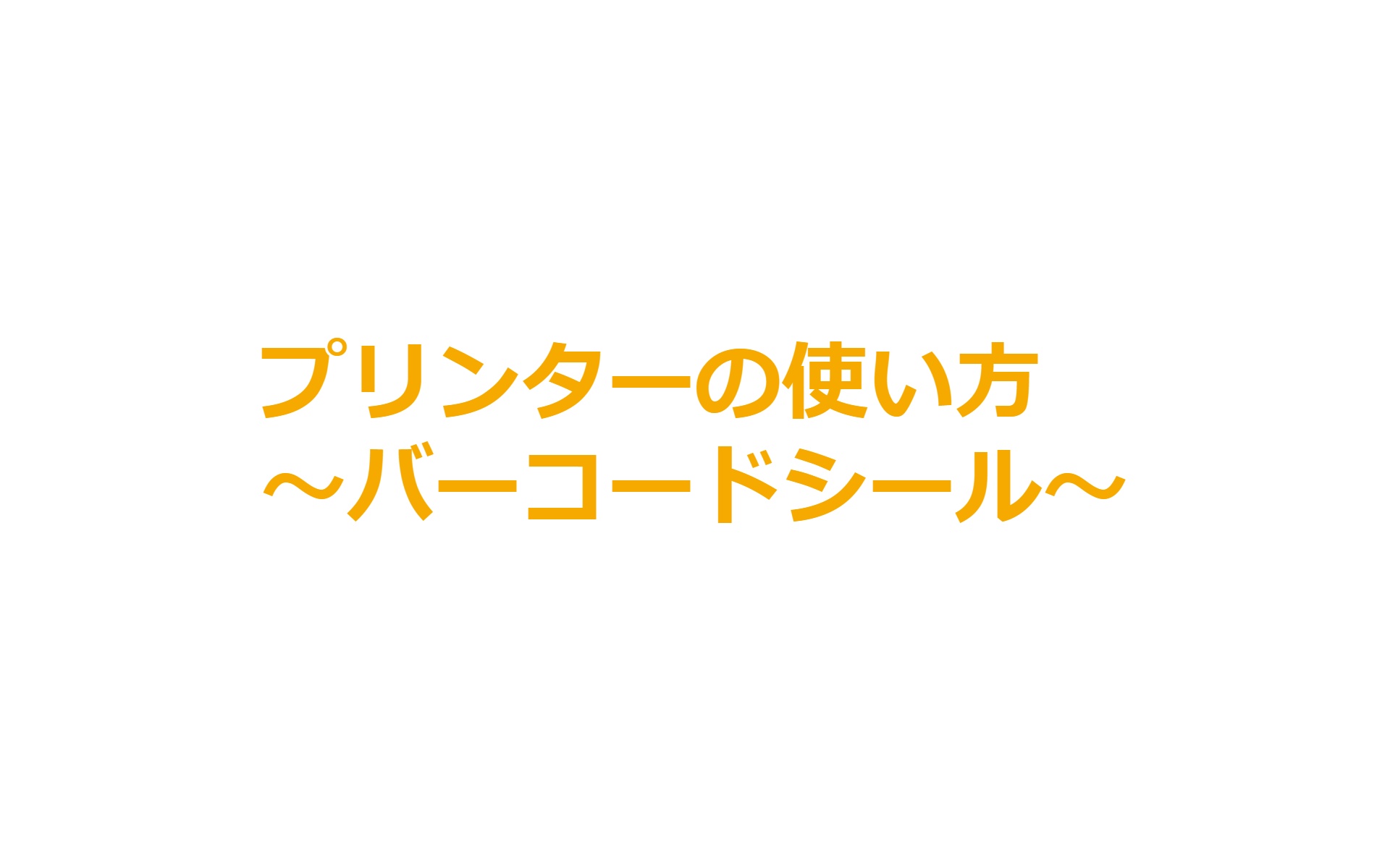 プリンターの使い方〜バーコードシール〜 STEP1:【動画】プリンターの使い方 STEP2:品番を入力し、「品番」を押す STEP3:正しく表記されているか確認する STEP4:「値付け」を選択し、枚数を入力後「!」を押す STEP5:シールが発行される STEP6:「包装」を選択する STEP7:商品を台にのせる STEP8:包装される STEP9:包装を終えたものを台から取り除く STEP10:右上にシールを貼る STEP11:【画像】作成画面