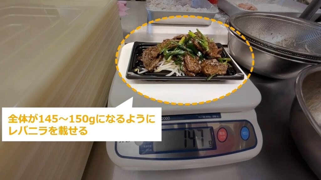 STEP20:レバニラ小の盛り付け(3/3):レバニラを50gくらい載せる