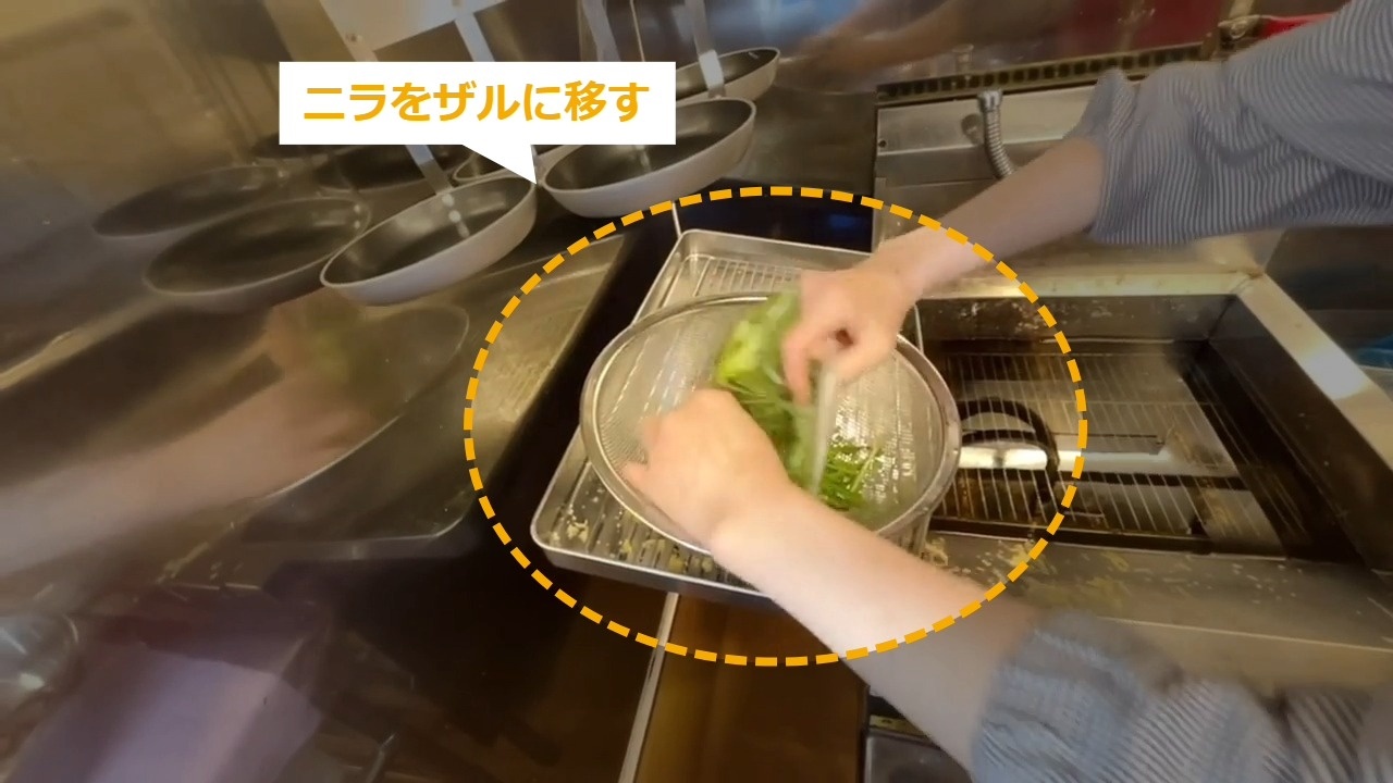 STEP8:ニラの油通し(1/3):ニラをザルに移す