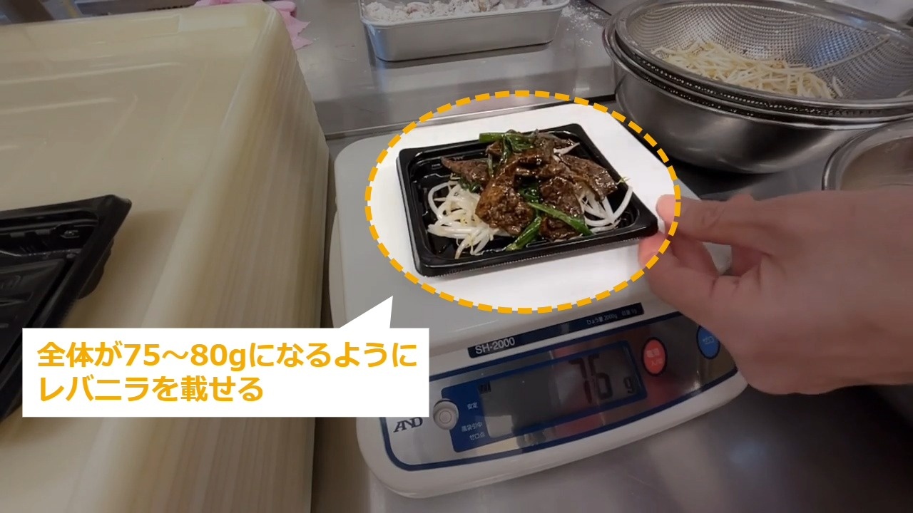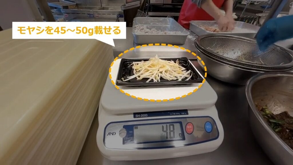 STEP22:レバニラ中の盛り付け(2/3):モヤシを45~50g載せる