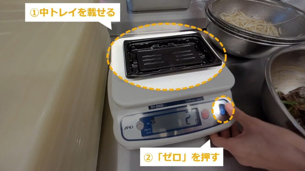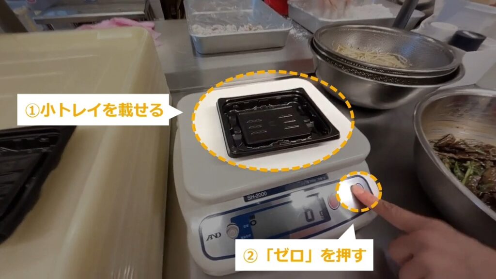 惣菜の分量を量るため、トレイの重さを差し引きます。