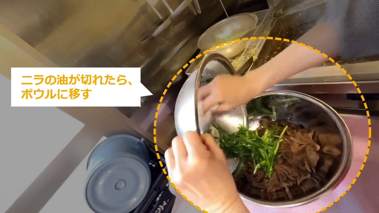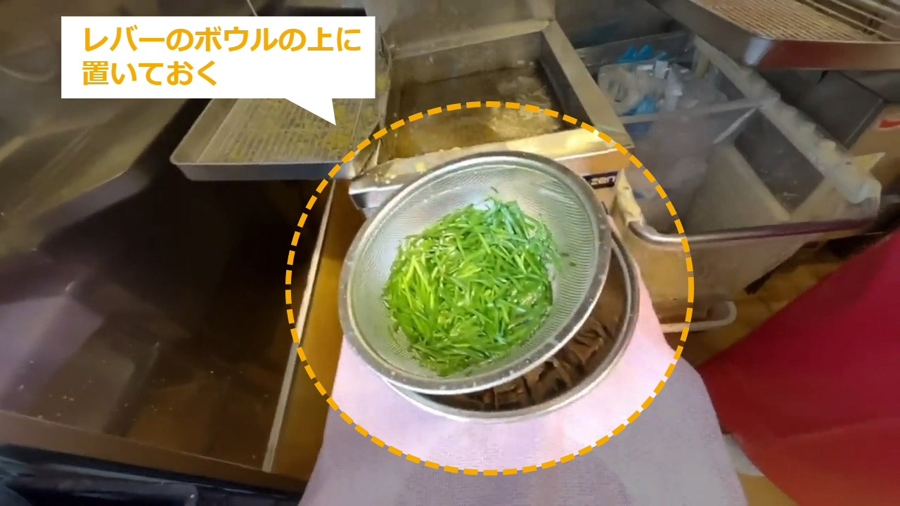 STEP10:ニラの油通し(3/3):レバーのボウルの上に置いておく
