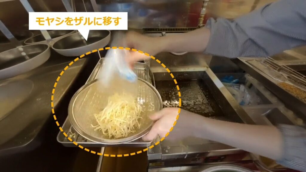 STEP11:モヤシの油通し(1/3):モヤシをザルに移す