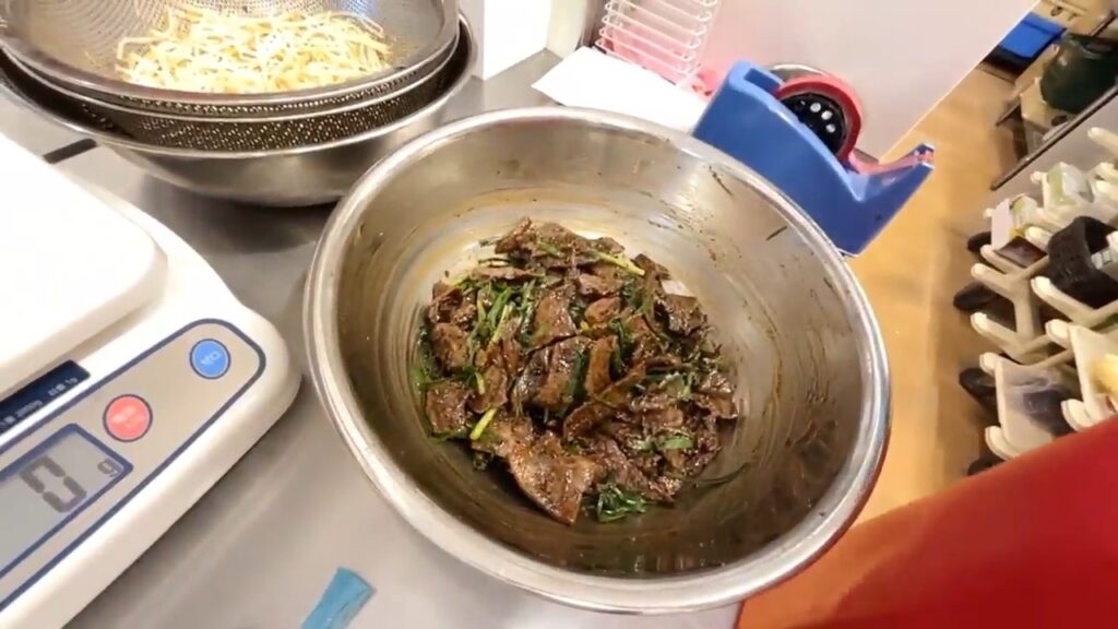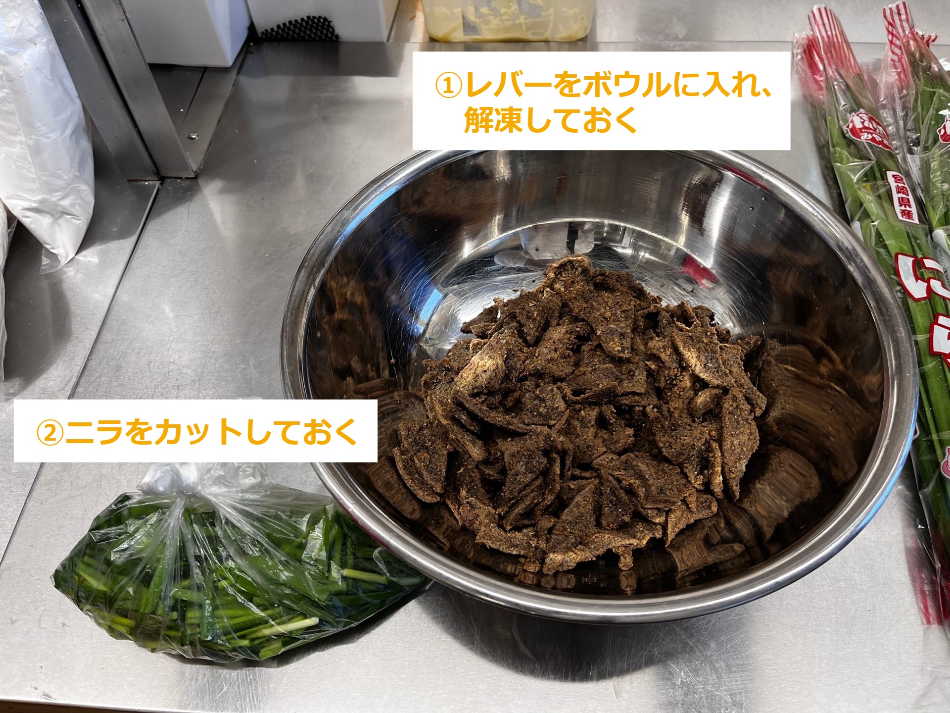 ・ニラをレバーの入ったボウルに移す