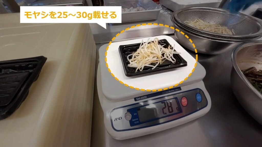 STEP19:レバニラ小の盛り付け(2/3):モヤシを25~30g載せる