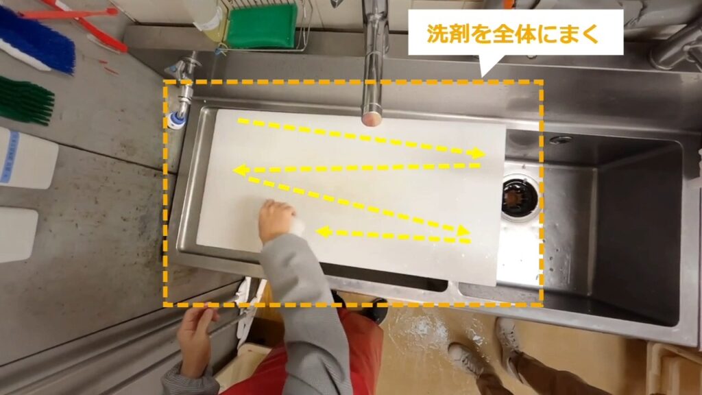 STEP6:まな板を洗う(2/6):洗剤を全体にまく