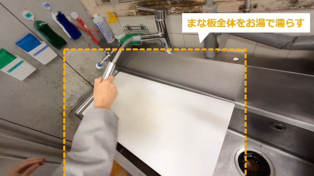 STEP5:まな板を洗う(1/6):まな板全体をお湯で濡らす
