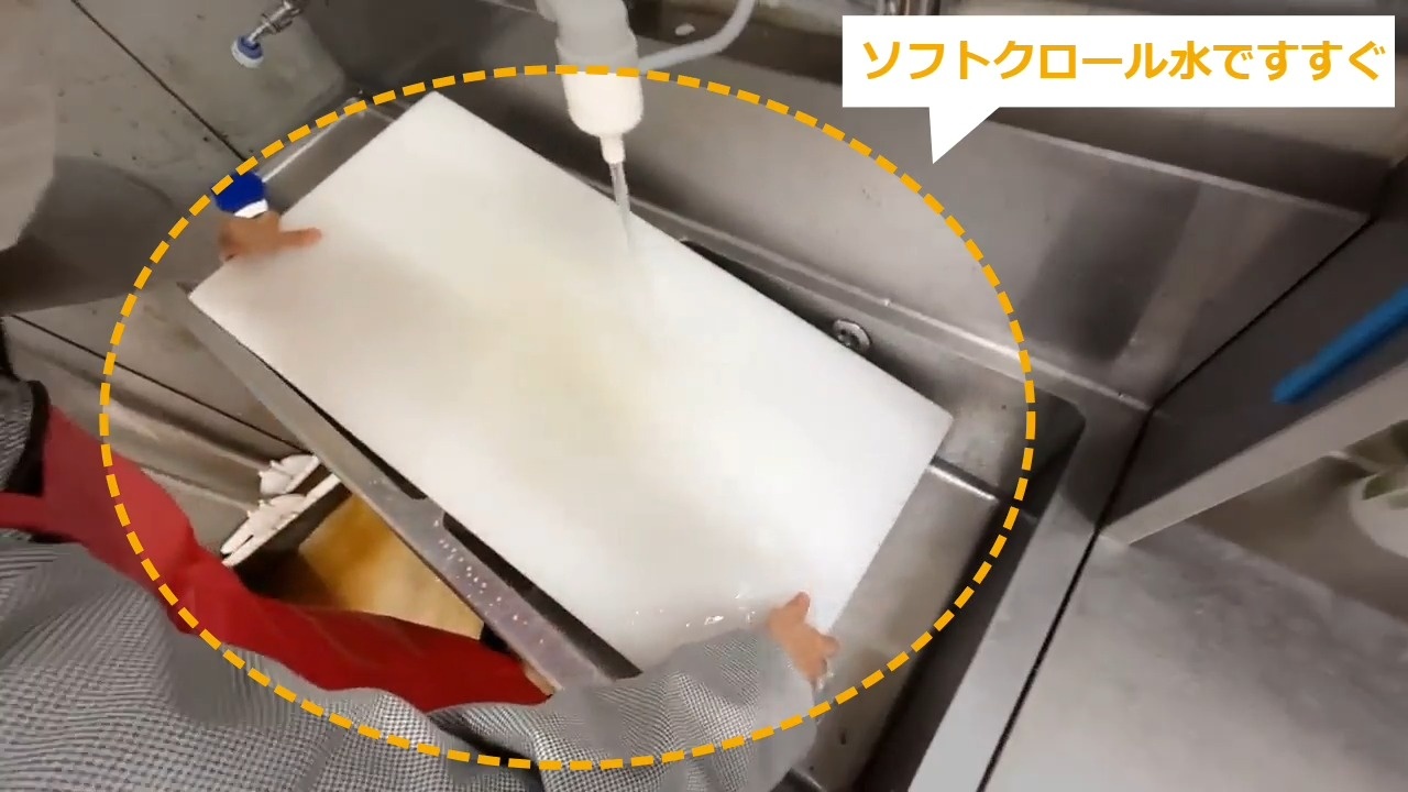STEP9:まな板を洗う(5/6):ソフトクロール水ですすぐ