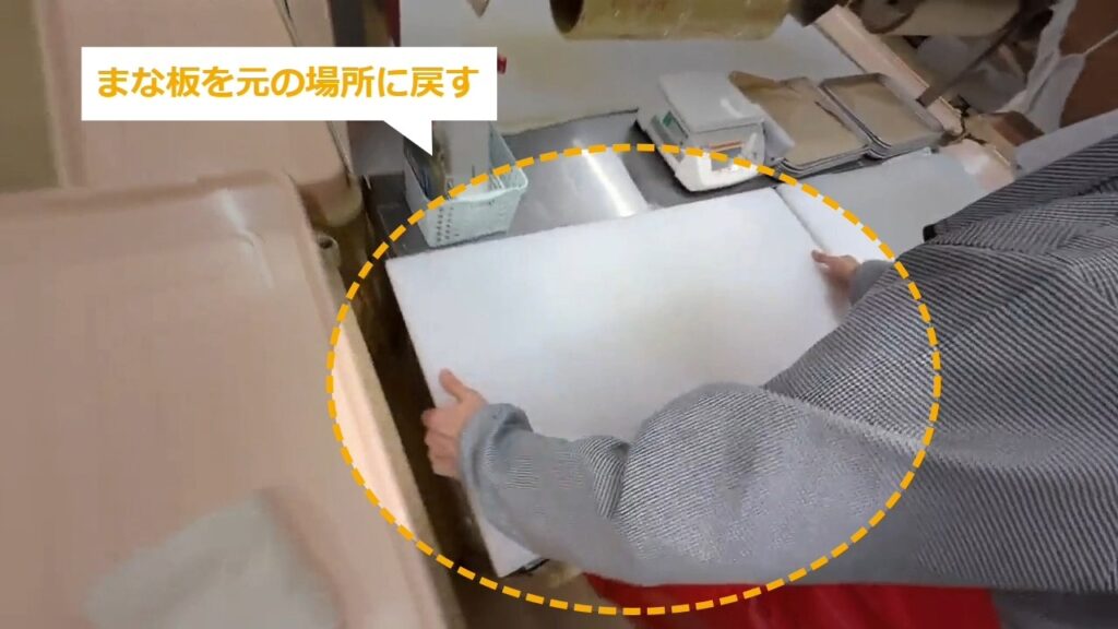 午前の作業が終了した後のまな板の洗浄方法を説明します。