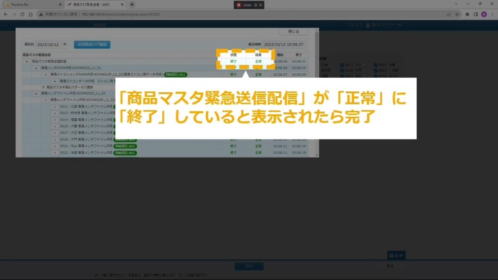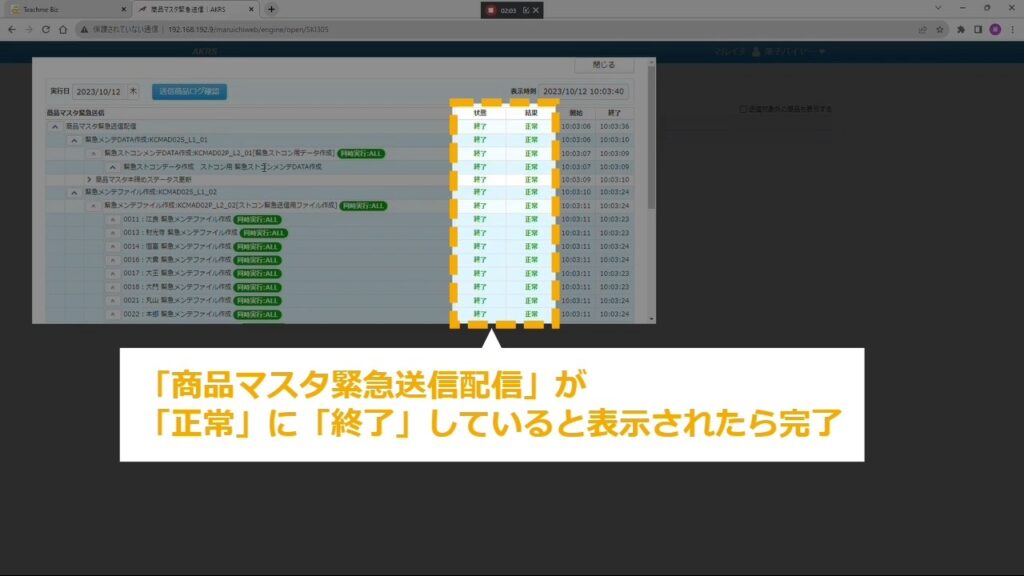 STEP19:「商品マスタ緊急送信配信」が「正常」に「終了」していると表示されたら完了