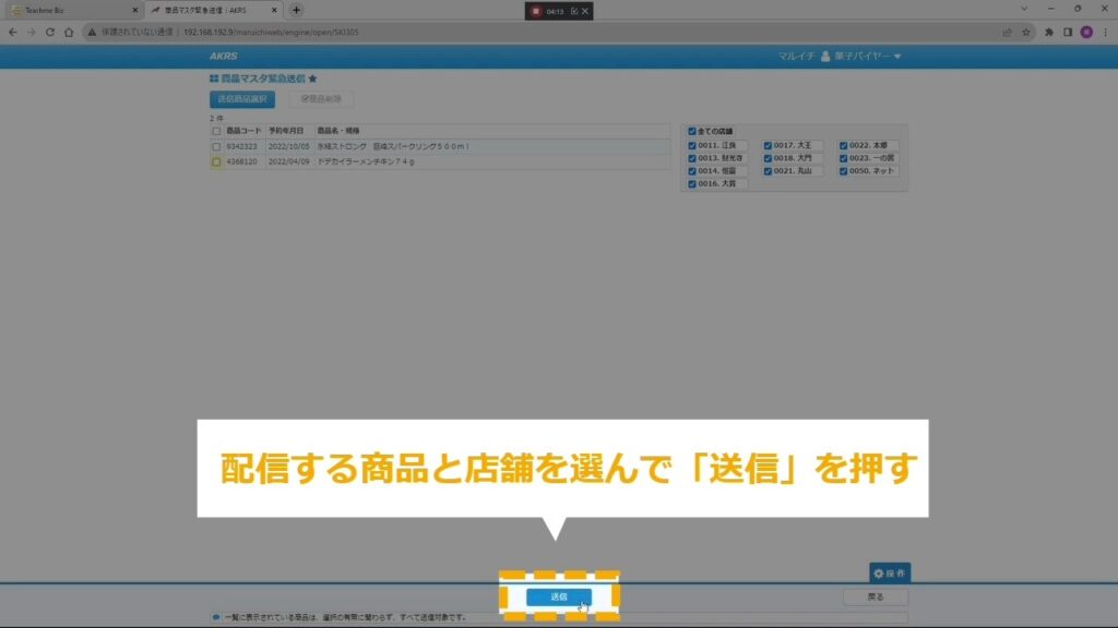 STEP17:配信する商品と店舗を選択し、「送信」を押す