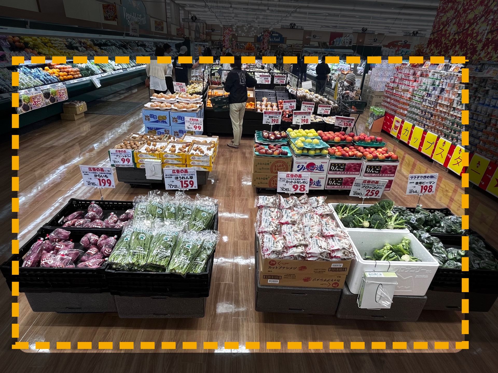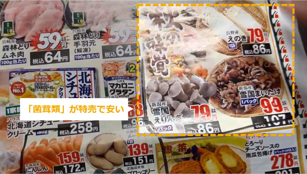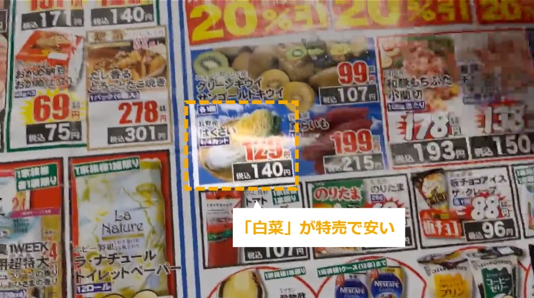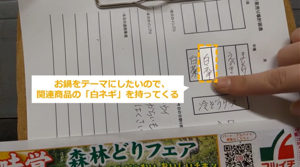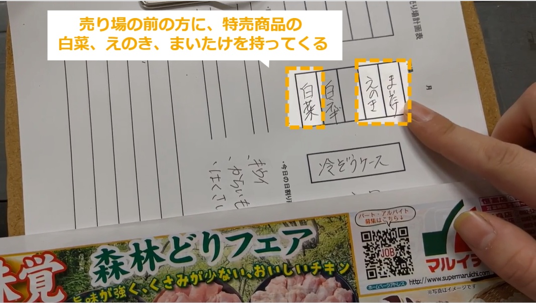 売り場計画表の作成方法 ・売り場計画表の作成方法について説明します。 STEP1~5:売り場計画表の作成方法 STEP1:【動画】売り場計画表の作成方法 STEP2:「白菜」が特売で安い STEP3:「菌茸類」が特売で安い STEP4:売り場の前の方に、特売商品の白菜、えのき、まいたけを持ってくる STEP5:お鍋をテーマにしたいので、関連商品の「白ネギ」を持ってくる