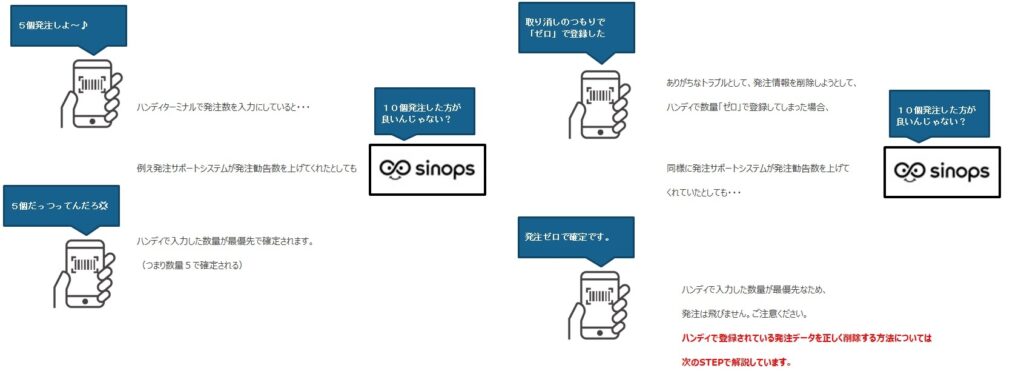 発注サポートシステムのSinopsと、ハンディの双方に発注データが存在している場合、 いかなる状況でもハンディに登録されている発注情報(人手で登録した情報)が最優先されます。