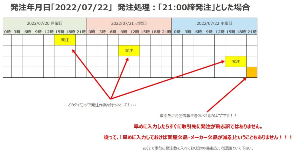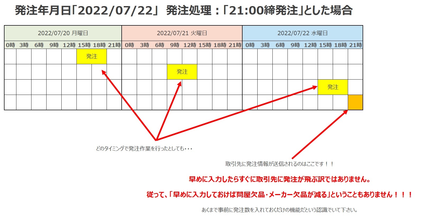 左図で図解しております。 あくまで取引先には、発注年月日の発注締め時間にしか発注データは飛んでいきません。 ご注意下さい。