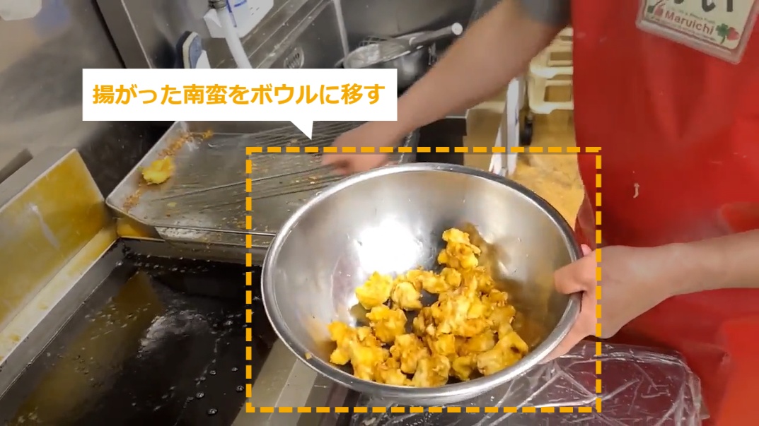 STEP23:揚がった南蛮をボウルに移す