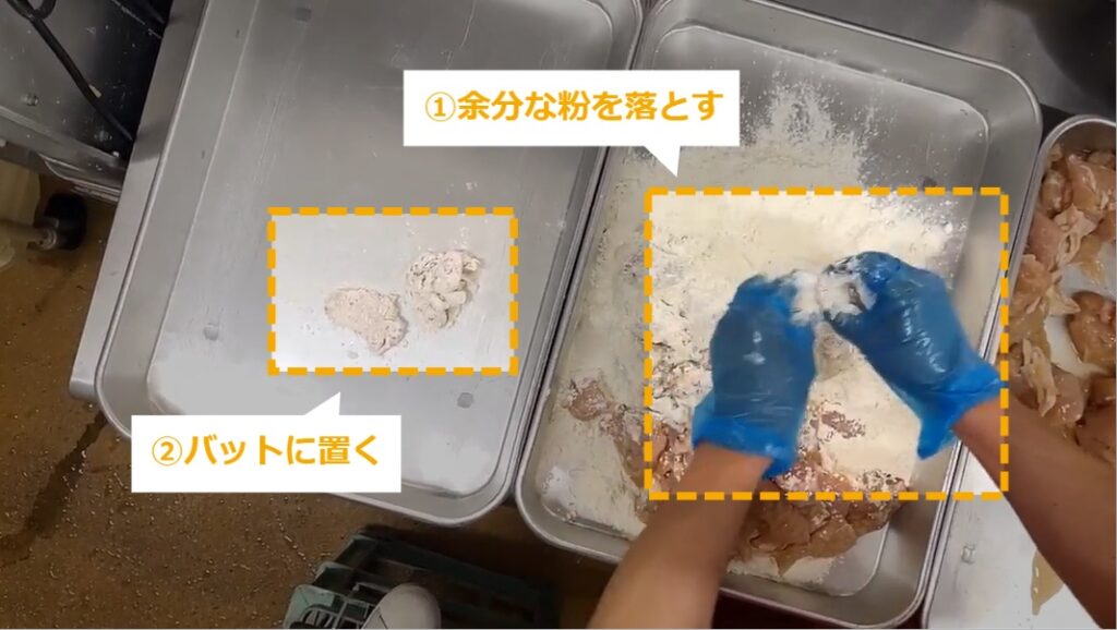 STEP7:余分な粉を落とし、肉をバットに置く