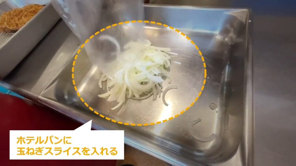 STEP7:玉ねぎと出汁を温める(1/6):ホテルパンに玉ねぎスライスを入れ