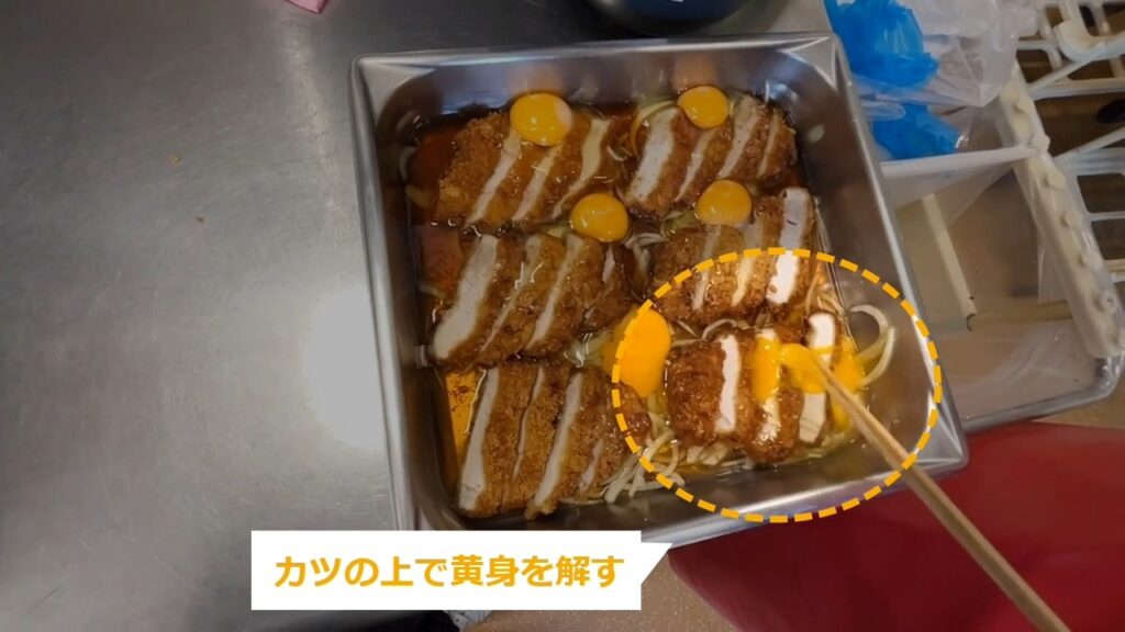 STEP19:卵を混ぜる(2/3):カツの上で黄身をほぐす