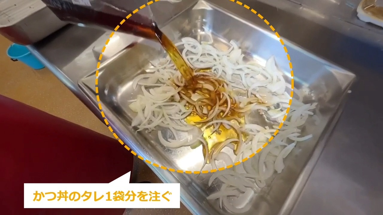 STEP9:玉ねぎと出汁を温める(3/6):かつ丼用タレを注ぐ
