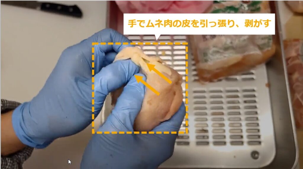 STEP4:手でムネ肉の皮を引っ張り、剥がす