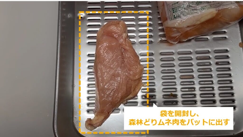 STEP2:袋を開封し、森林どりムネ肉をバットに出す