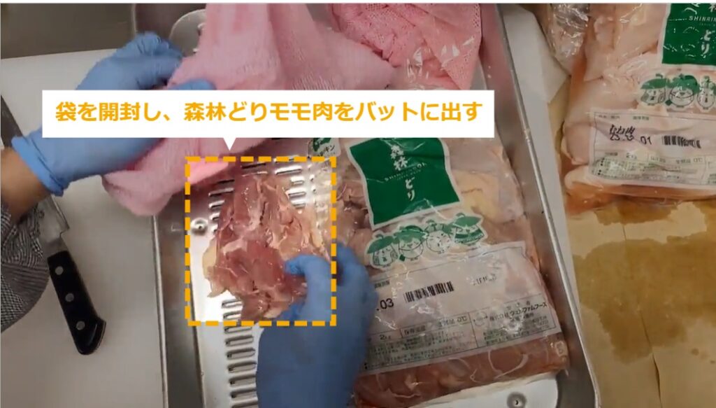 STEP2:袋を開封し、森林どりモモ肉をバットに出す