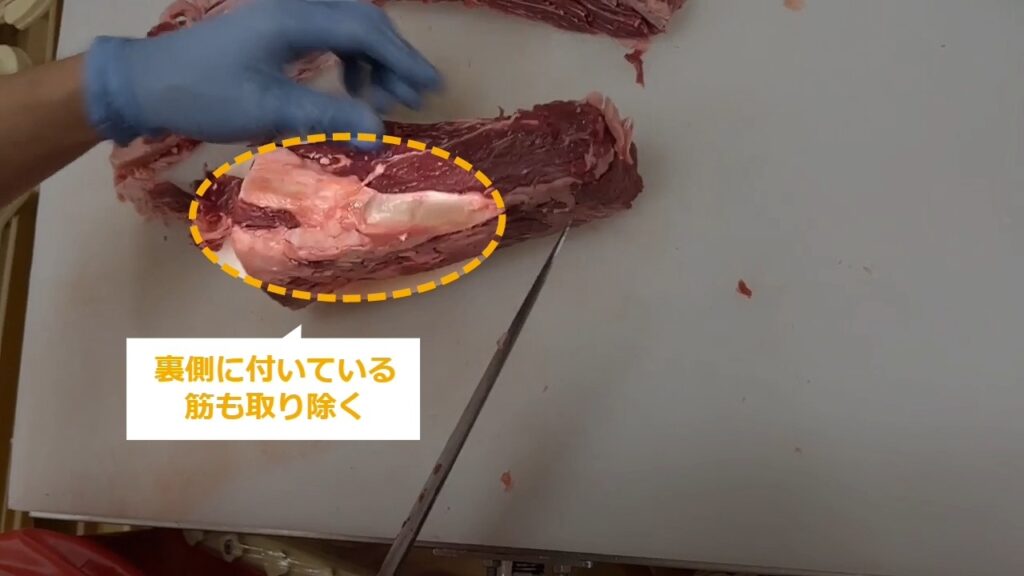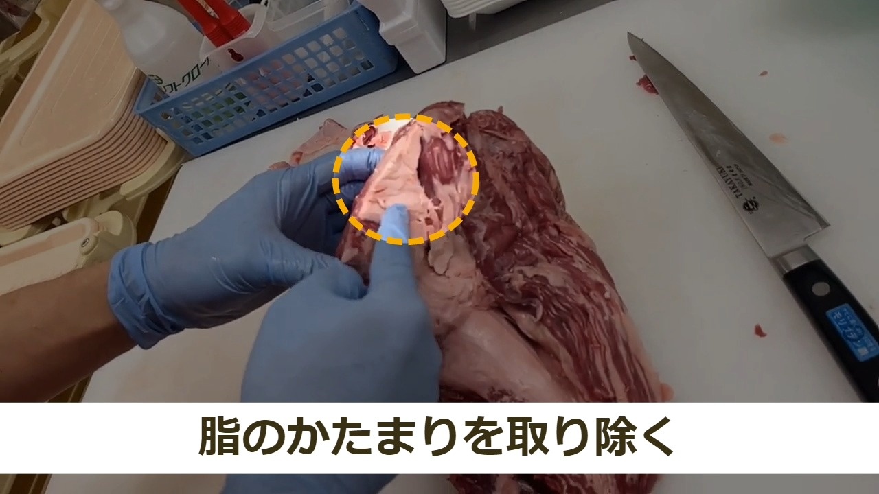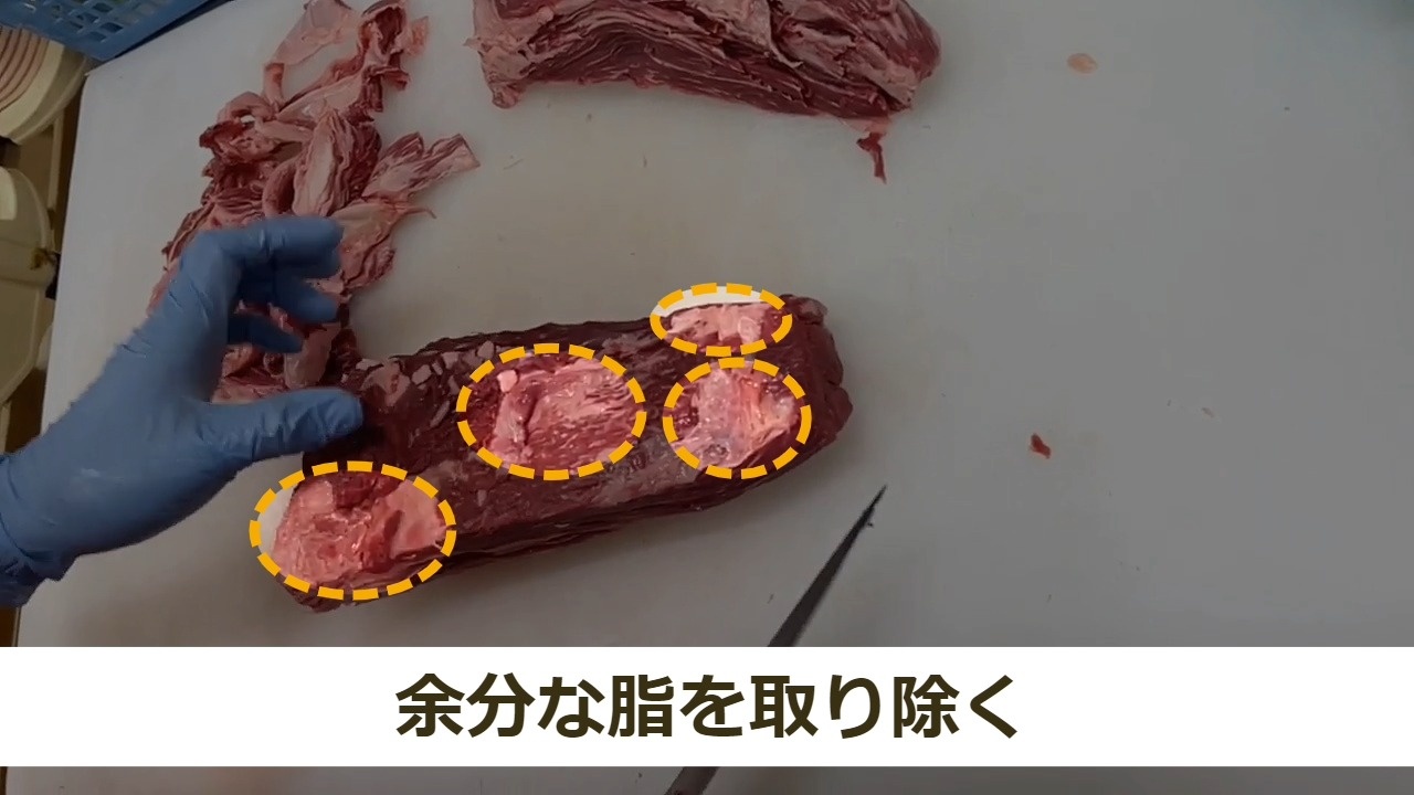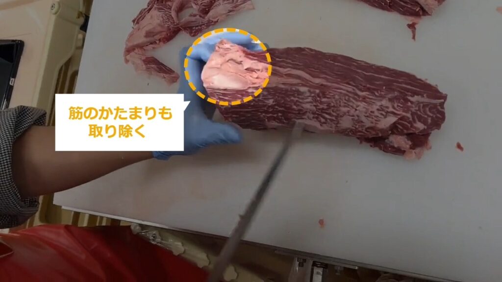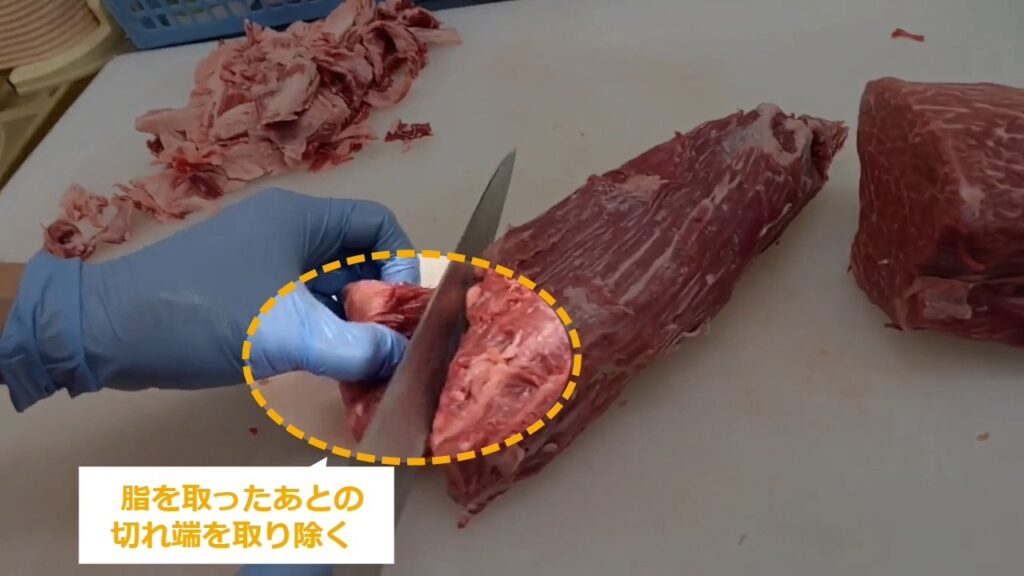・「牛ヒレ(バット)」のトリミングについて説明します。