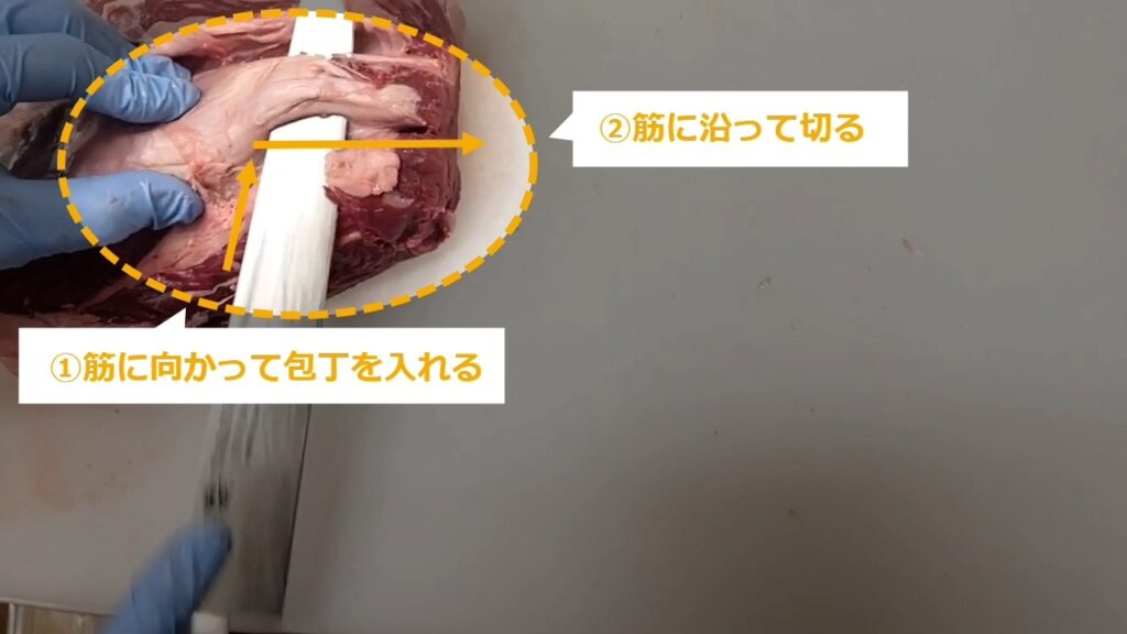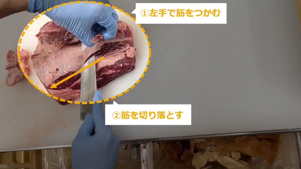 STEP9:筋を取り除く(5/5) 左手で脂をつかみながら筋を切り落とす