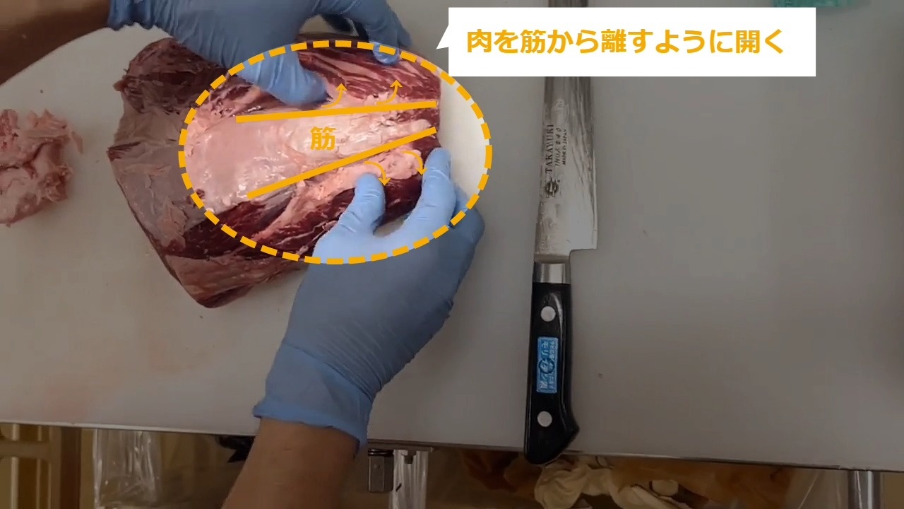 STEP7:筋を取り除く(3/5) 肉を筋から離すように開く