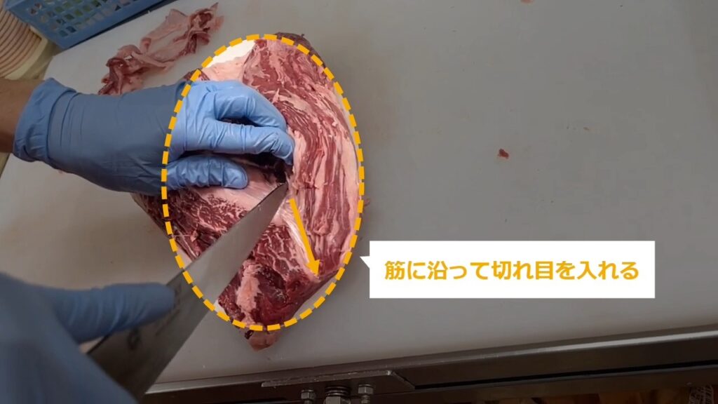 STEP11:脂のかたまりを取り除く(2/3) 筋に沿って切れ目を入れる