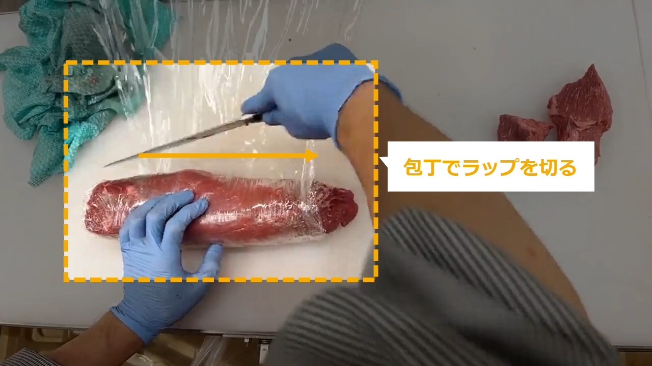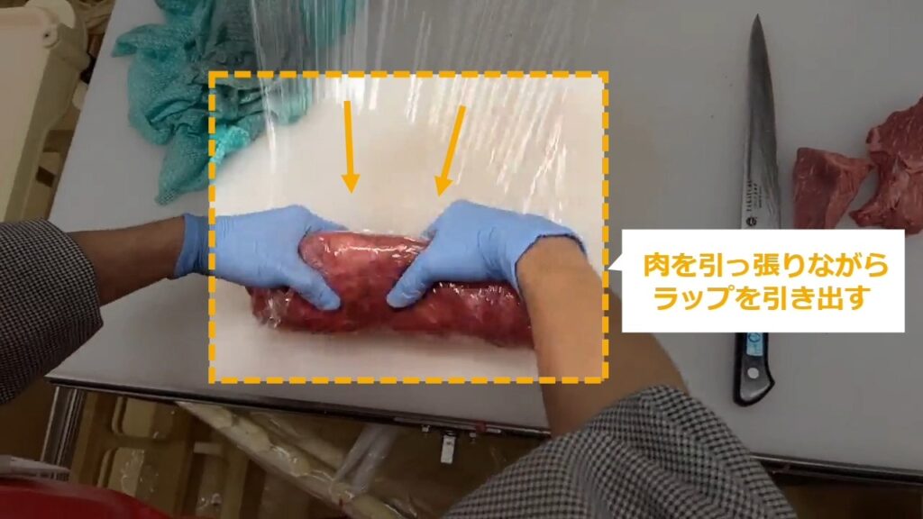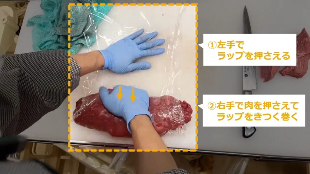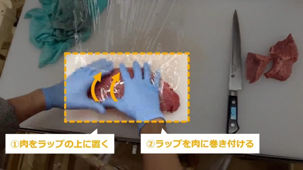 STEP6:肉をラップで巻く(4/4)