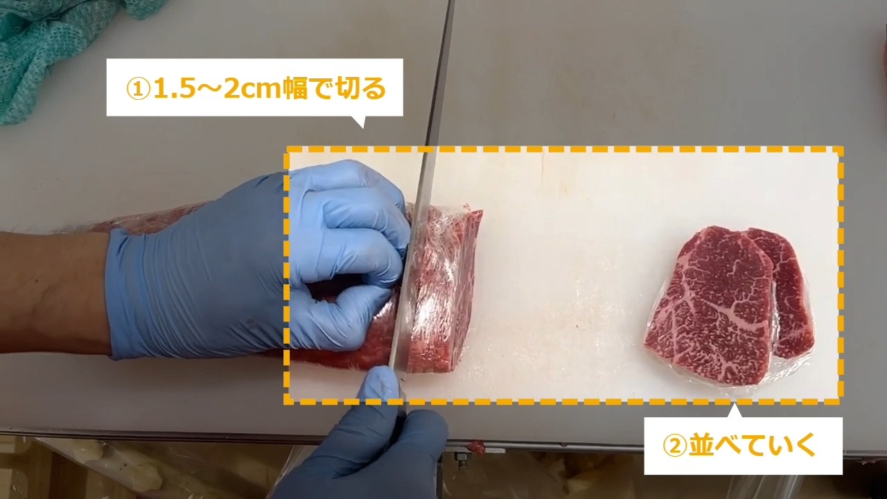 STEP1~10:商品化 ※「牛肉こもも」のトリミングについてはリンク先を参照してください。 https://teachme.jp/120297/manuals/22261207