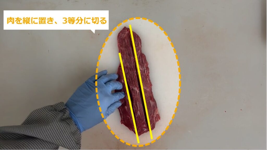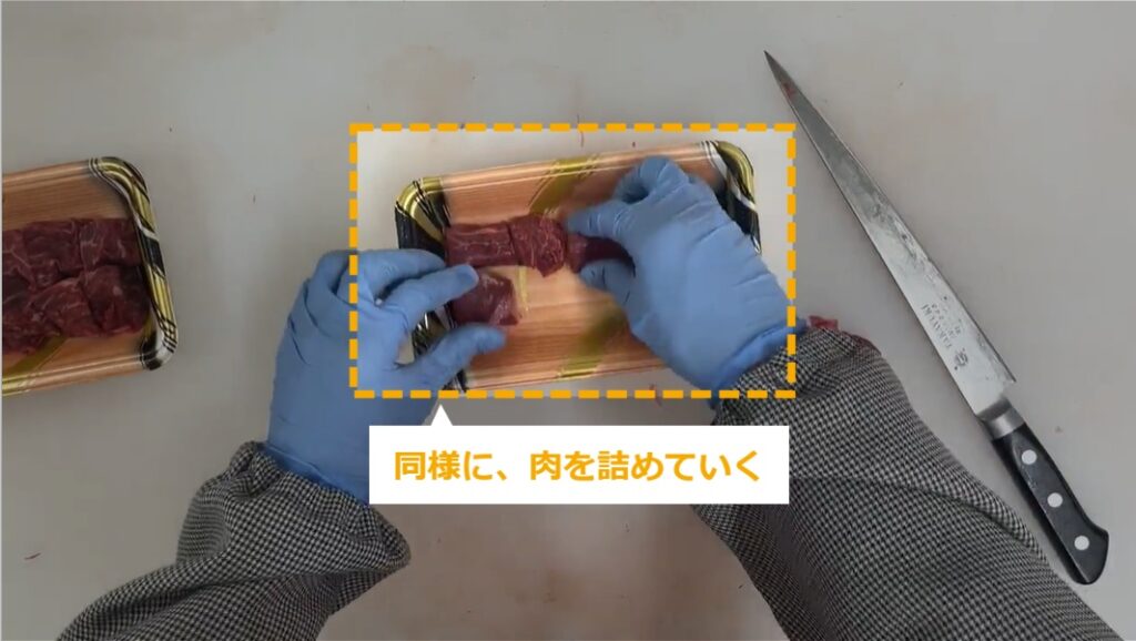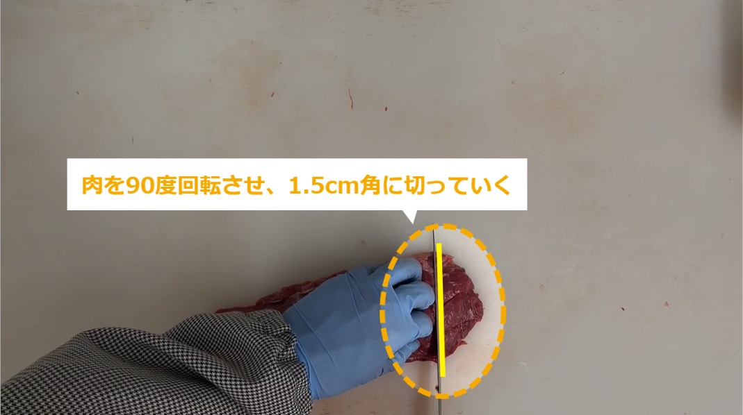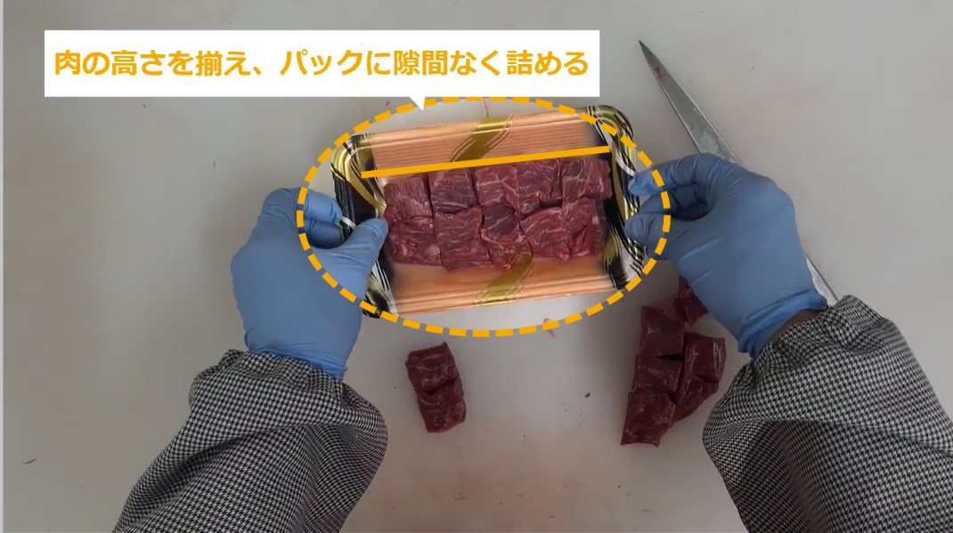 牛肉サイコロステーキ(もも) ・牛肉サイコロステーキ(もも)の商品化について説明します。 STEP1~:牛肉サイコロステーキ(もも)の商品化 STEP1:【動画】牛肉サイコロステーキ(もも)の商品化 STEP2:肉を縦に置き、3等分に切る STEP3:肉を90度回転させ、1.5cm角に切っていく STEP4:肉の高さを揃え、パックに隙間なく詰める STEP5:同様に、肉を詰めていく